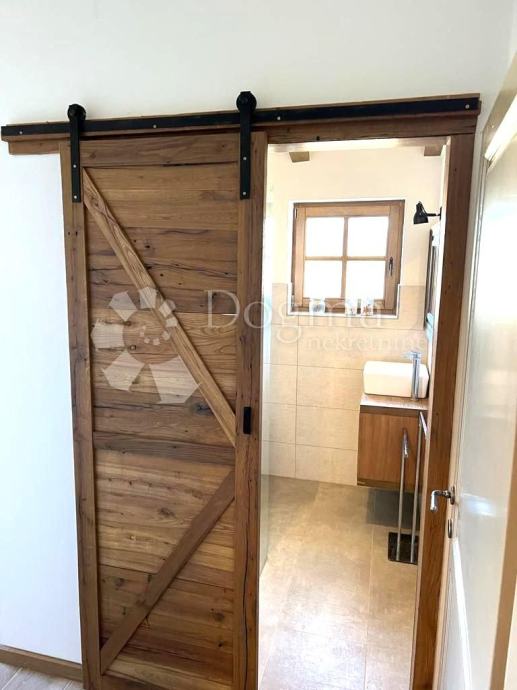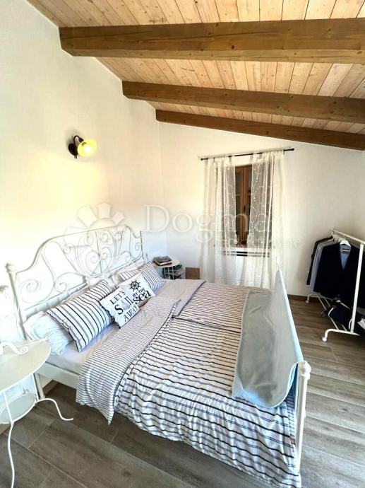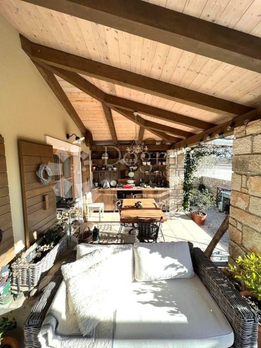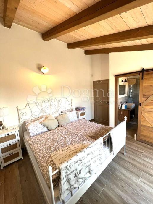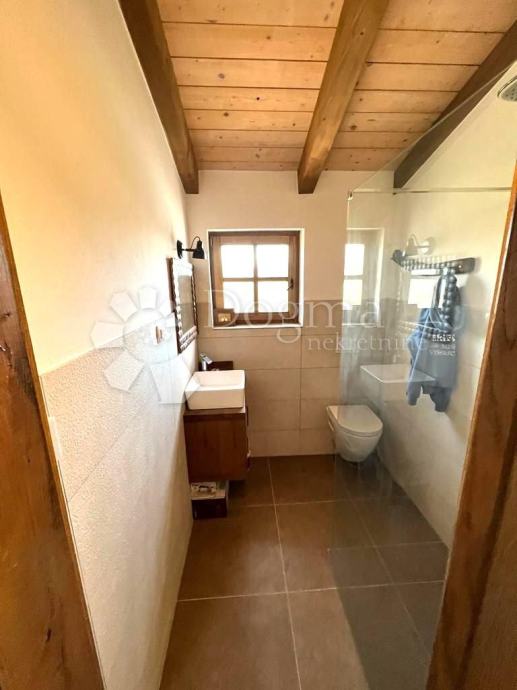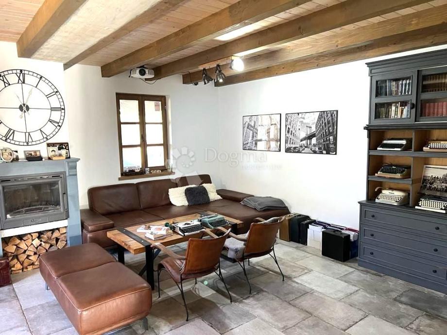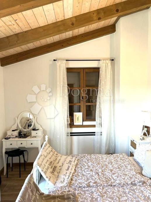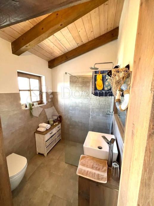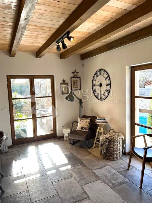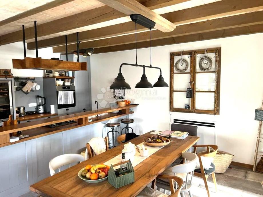 Interijer ove kuće je funkcionalno uređen i nosi rustikalni karakter, pružajući toplinu prostoru zahvaljujući drvenim gredama, istarskom kamenu te obilju prirodne svjetlosti. Posebno ugodan ugođaj stvara kamin, neizostavan u hladnim zimskim mjesecima.