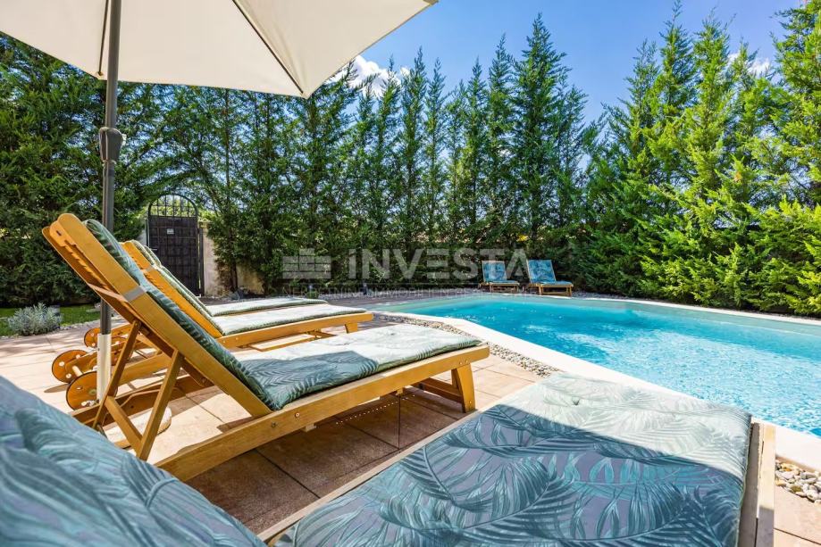 U dvorištu od 142m2 smješten je bazen veličine 28m2, sunčalište, vanjski tuš, roštilj i natkrivena terasa s blagovaonskim stolom za druženje.