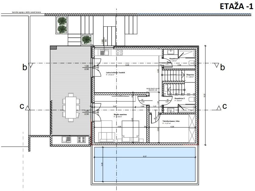 U suterenu je apartman za goste ili za iznajmljivanje To je i dodatni prostor – ljetna kuhinja, sauna i klub prostorija (šank + biljar) ili samo apartman za iznajmljivanje.