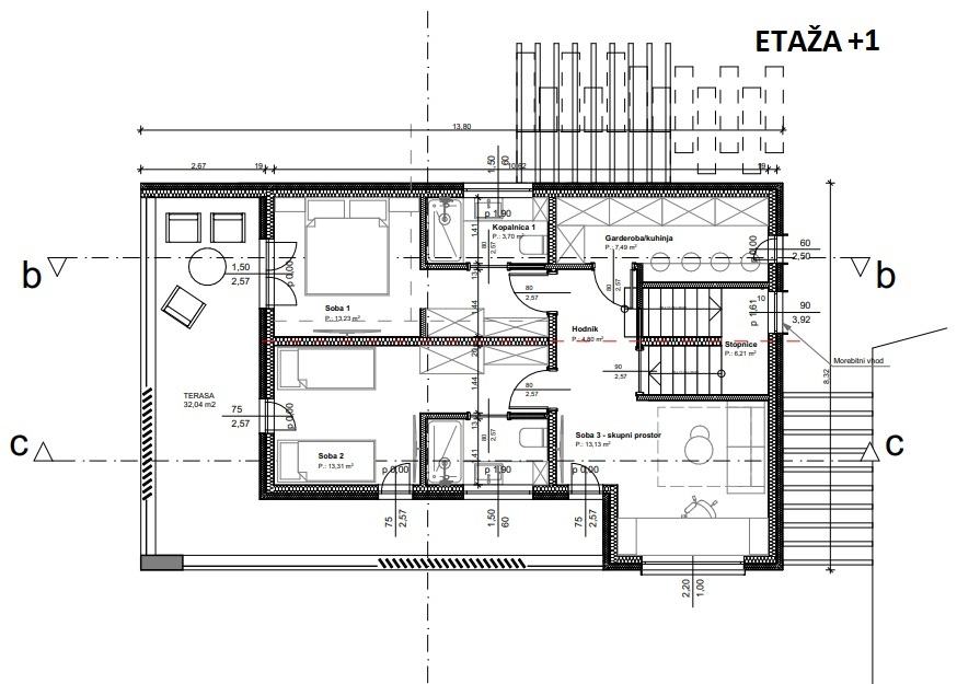 Potkrovlje ima mogućnost potpuno odvojene cjeline, tako da osim dvije sobe i prostrane terase ima i kuhinju i dnevni boravak.