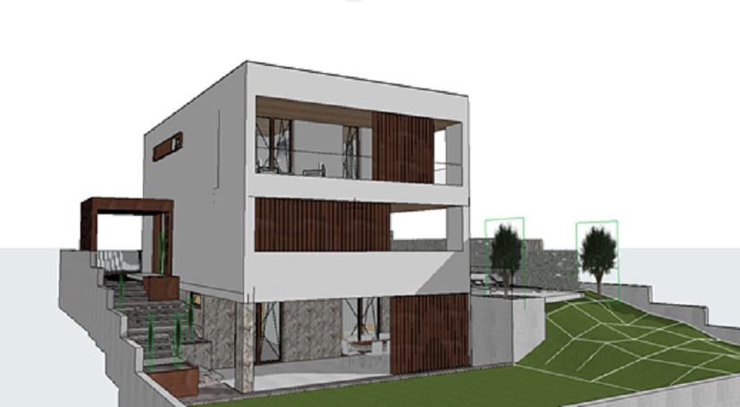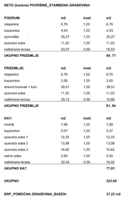 Vila je smještena na parceli površine 478 m2. Površine je 223,66 m2 i ima tri etaže, 7 soba i 4 kupaonica s wc-om.