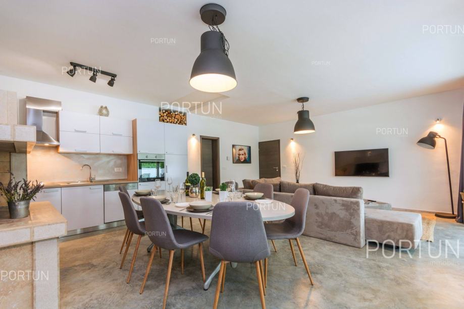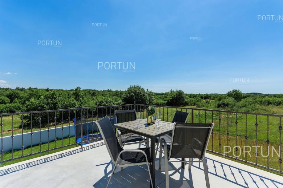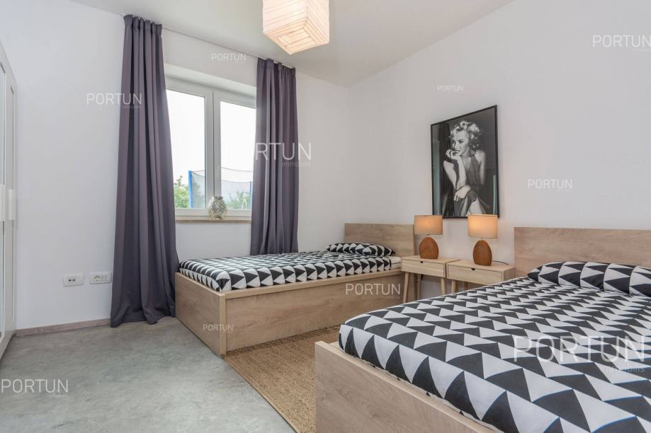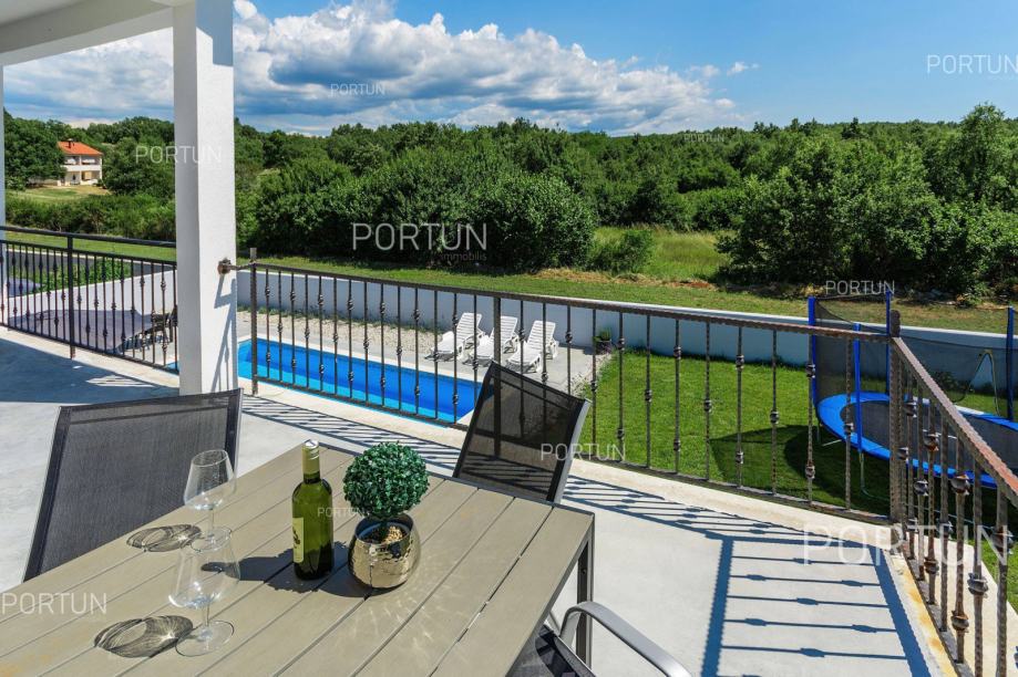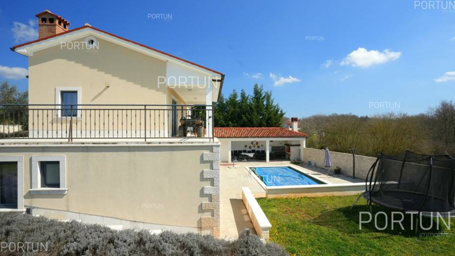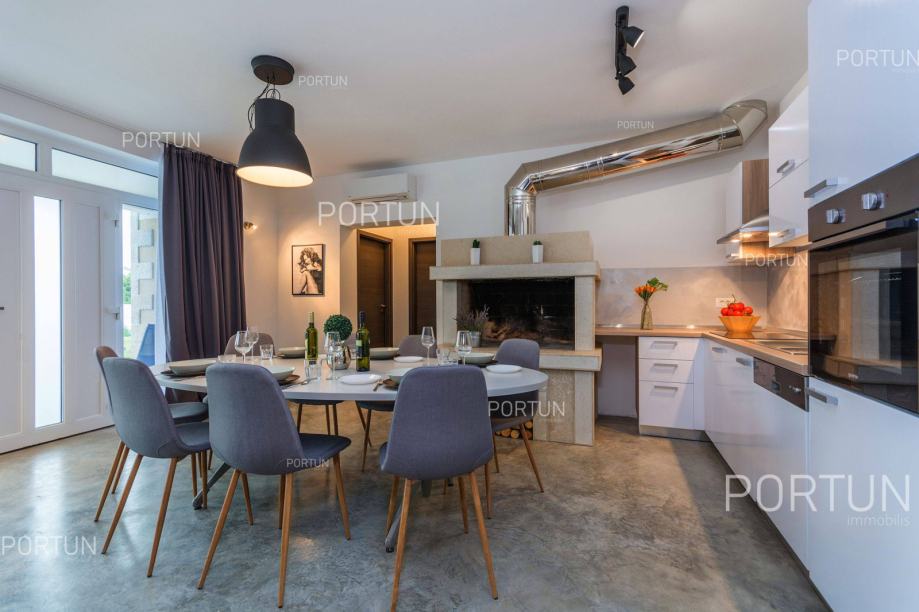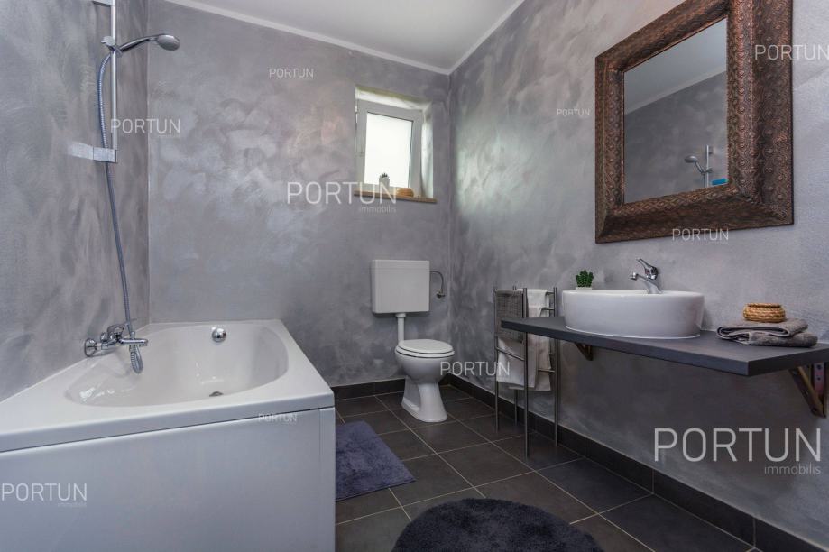U unutrašnjosti Istre, u zelenom okruženju između Poreča i Pazina, prodaje se kuća za odmor u kojoj se mogu smjestiti dvije veće obitelji, a raspolaže s bazenom i uredno njegovanom okućnicom. Veći stan, onaj sa četiri spavaće sobe nalazi se u prizemlju, dok se stan s dvije spavaće sobe i velika terasa nalaze na prvom katu. Ugodan interijer kuće suvremeno je uređen i prilagođen današnjim standardima. Vrt je osmišljen kao vanjska zona za rekreaciju na travnjaku ili opuštanje uz zabavu na bazenu. Iz kuće se pruža pogled na tipični krajolik središnje Istre – autohtonu šumu ispresijecanu livadama i vinogradima. Kuća je nedavno izgrađena za potrebe iznajmljivanja, a prodaje se zajedno s namještajem i opremom. Kuća je pažljivo održavana pa novi vlasnik može odmah nastaviti s iznajmljivanjem, a budući da ima čak 12 kreveta, budući vlasnik može računati s nešto većim prihodom od najma u odnosu na jednoobiteljske kuće. KLJUČNE OSOBINE✔ 1 Vlasnički četverosobni stan│ 1 Dvosobni apartman✔ 6 Spavaćih soba | 3 Kupaonice | 1 WC | 12 Ležaja✔ Pomoćna građevina - 40,00 m2✔ Bazen - 32,00 m2✔ Seoski ambijent nedaleko od Tinjana✔ Plaža 17 km SAZNAJTE VIŠEViše informacija o oglasu broj 20820 saznajte na https://portun.comDirektan link na oglas: https://portun.com/hr/20820/Za sva dodatna pitanja na raspolaganju je agent posredovanja Alesandro Laginja +385919386003