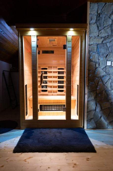Moderni uređaji: frižider, ledenica, Miele perilica suđa, pećnica i indukcijska ploča, tri LED TV-a, IR sauna, perilica rublja i sušilica.
