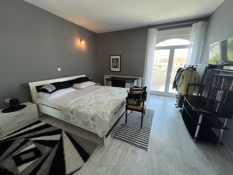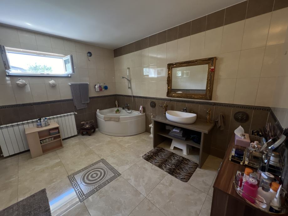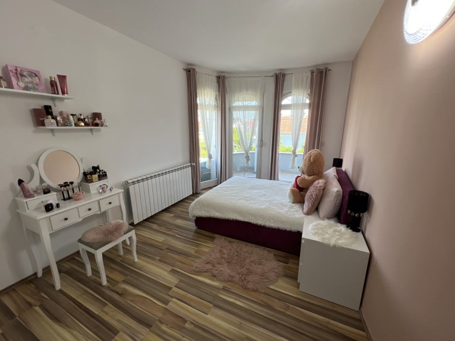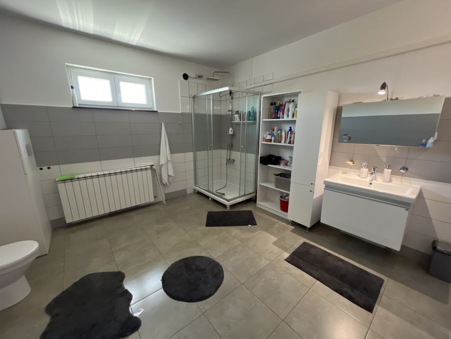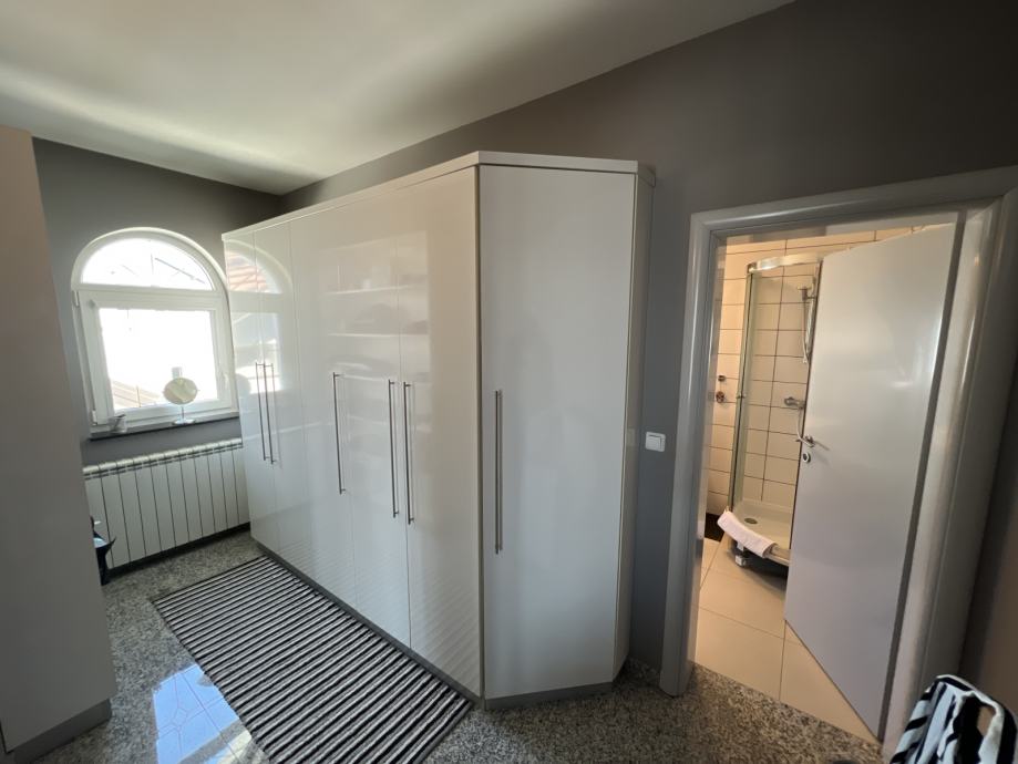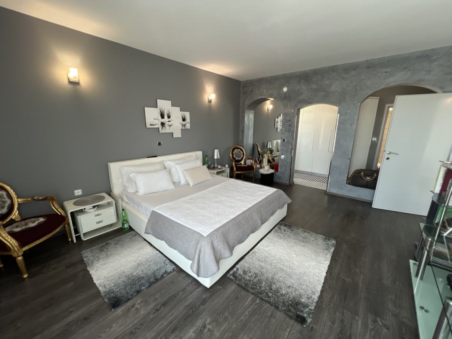 Od prostorija na katu imamo 4 spavaće sobe (svaka sa vlastitim izlazom na balkon/terasu) od kojih je jedna suite sa walk in ormarom i vlastitom kupaonicom te jednu prostranu zajedničku kupaonicu.