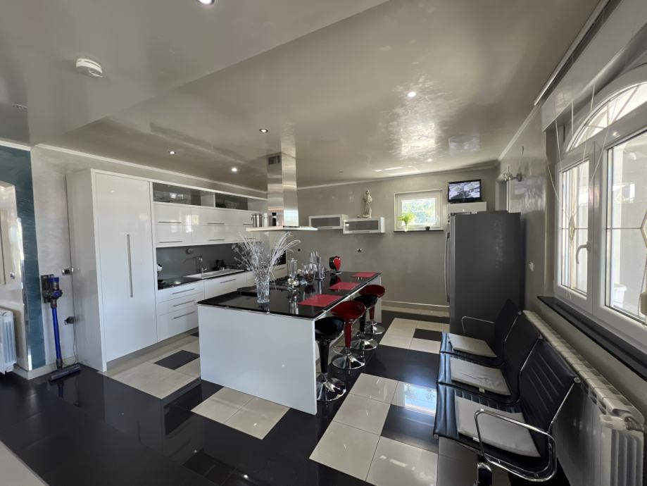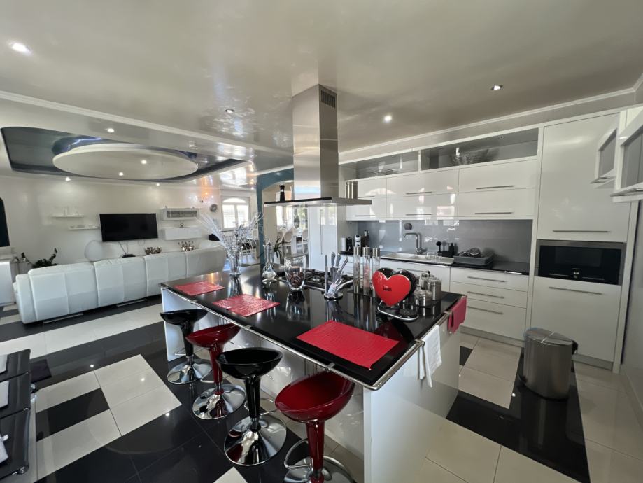 U moderno uređenoj kuhinji nalazi se otok na kojem su smješteni plinski štednjak sa stropnom napom, prostor za blagovanje i barske stolice.
