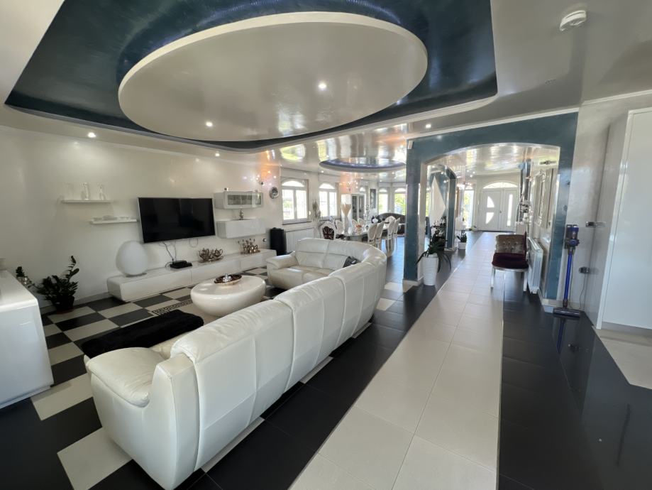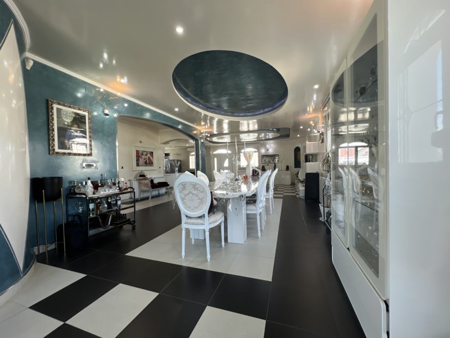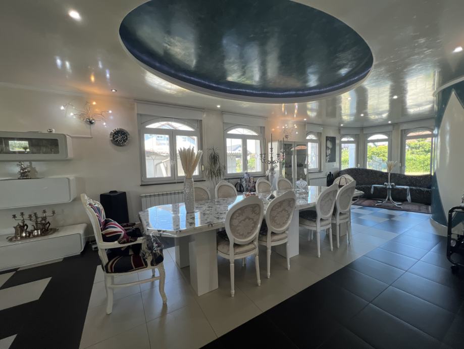 U centralnom dijelu dnevnog prostora nalazi se prekrasni blagovaonski stol sa 10 stolica, a s obje strane istog smještena su područja za odmor sa sofama, bar i entertainment uređaji.