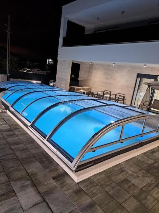 Na prodaju je moderna, potpuno namještena kuća s grijanim i natkrivenim bazenom, smještena samo 300 metara od mora i plaže.