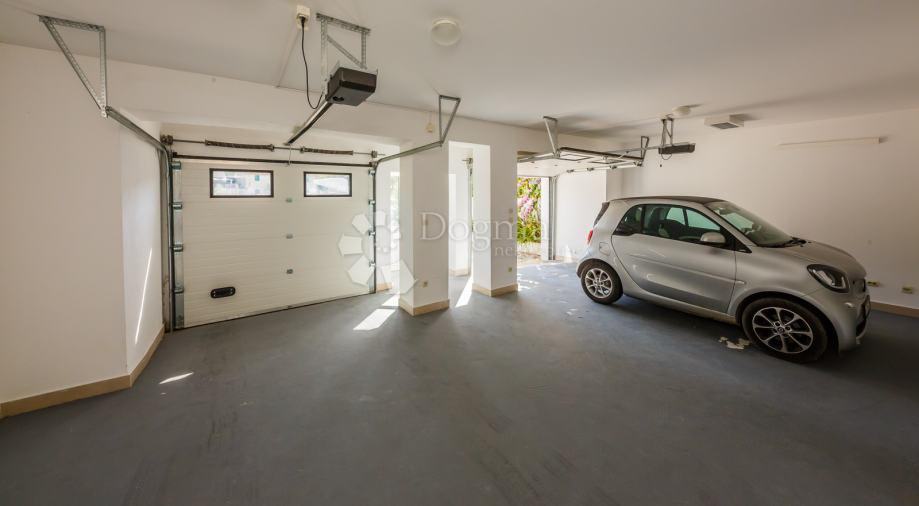 Nekretnina se sastoji od četiri etaže. U prizemlju se nalazi garaža s automatskim sekcijskim vratima za dva vozila, poslovni prostor, ured, praonica rublja, spremište i kupaonica s WC-om. Prvi, drugi i treći kat uređeni su kao zasebni apartmani s vlastitim ulazima. Svaki kat sadrži tri spavaće sobe, tri kupaonice s WC-om, kuhinju, blagovaonicu i dnevni boravak, kao i balkon s otvorenim pogledom na more. Svaka soba je opremljena vlastitim klima uređajem. Vrt se nalazi na razini prvog kata.