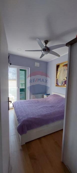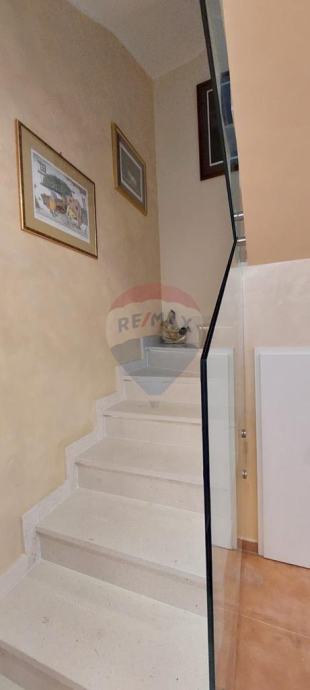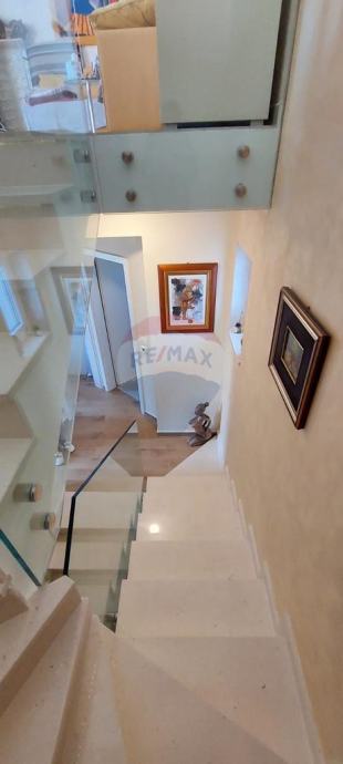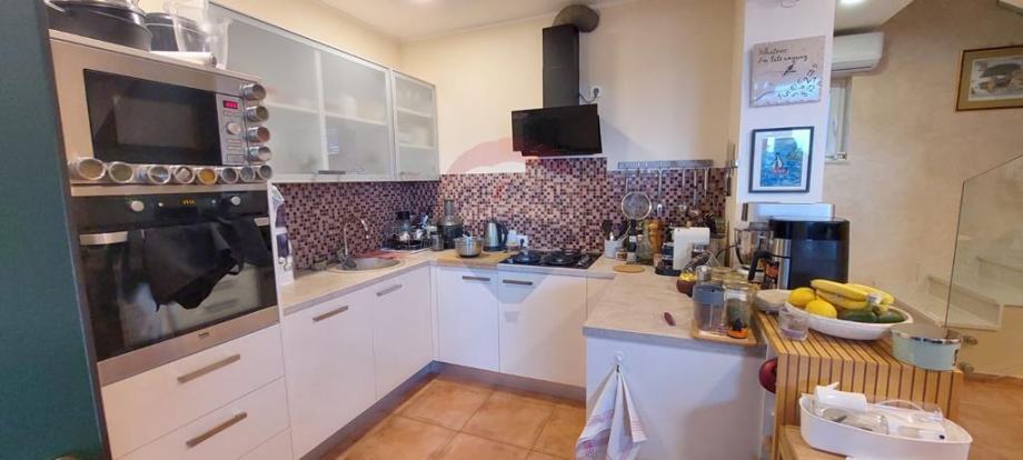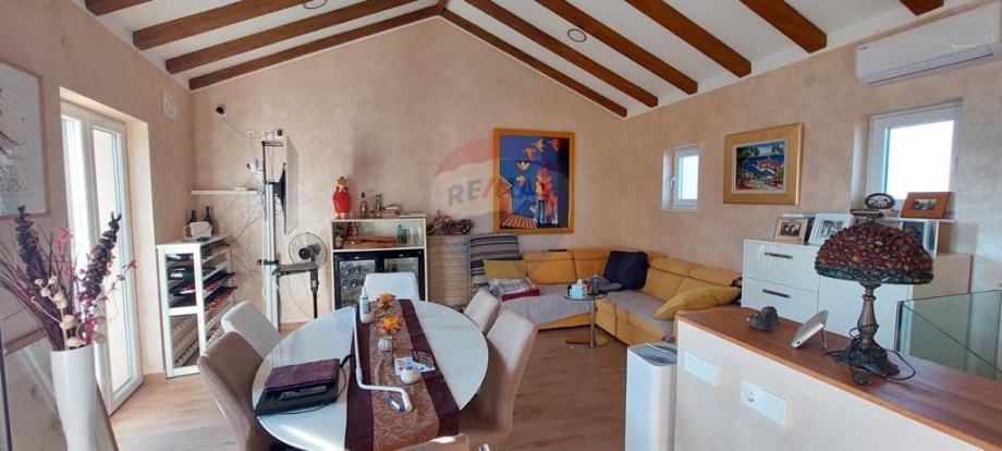 U prizemlju se nalazi kuhinja s blagovaonom, dnevni boravak, toalet i zatvorena terasa od 20 m2. Na prvom katu dvije su spavaće sobe s izlazom na balkon i kupaonica.