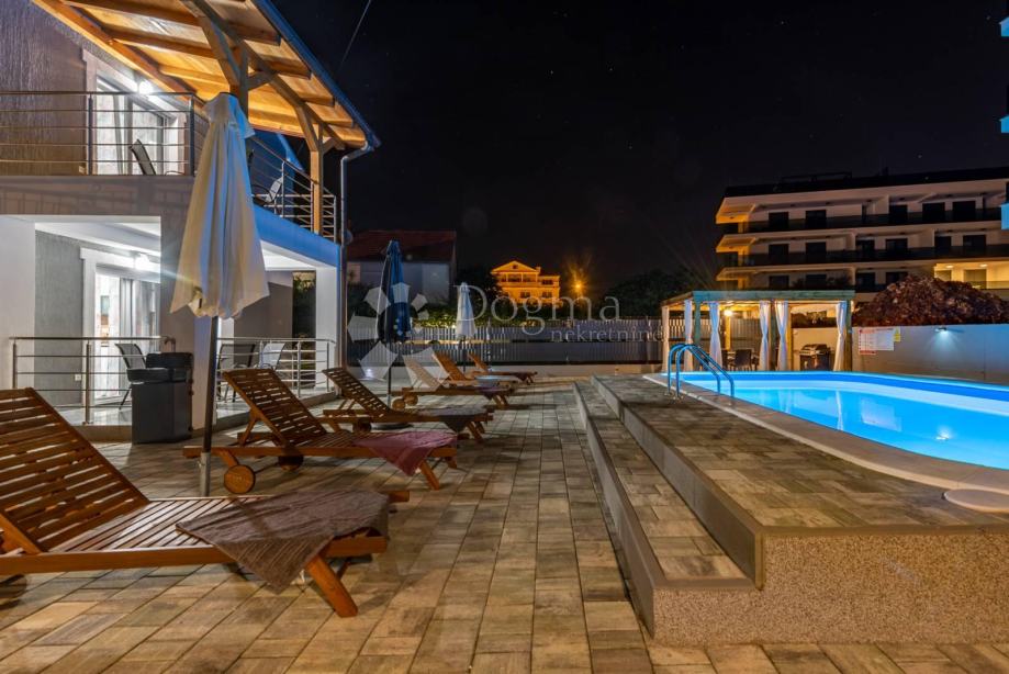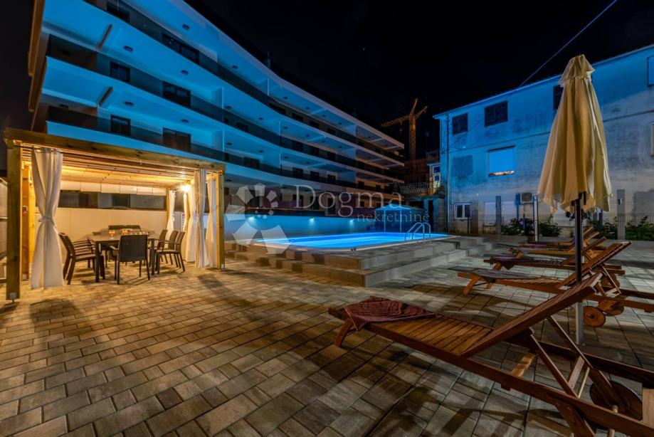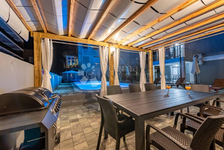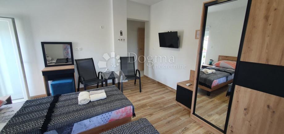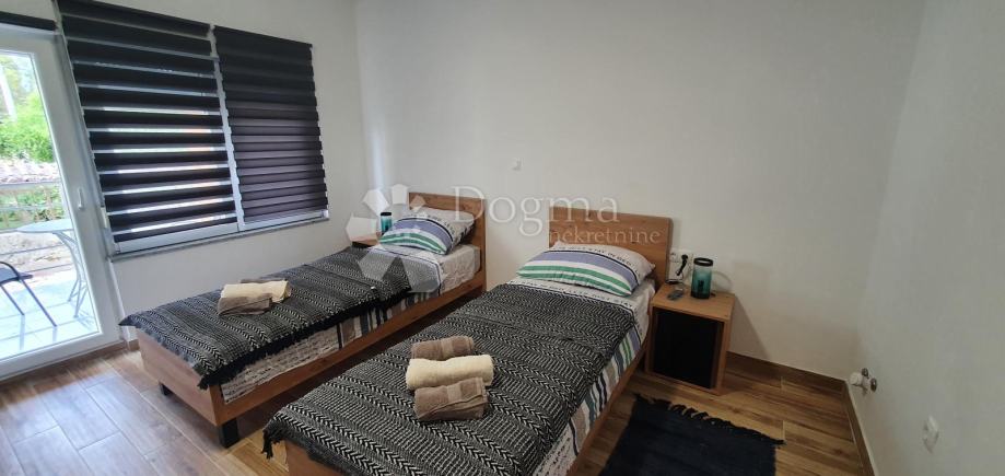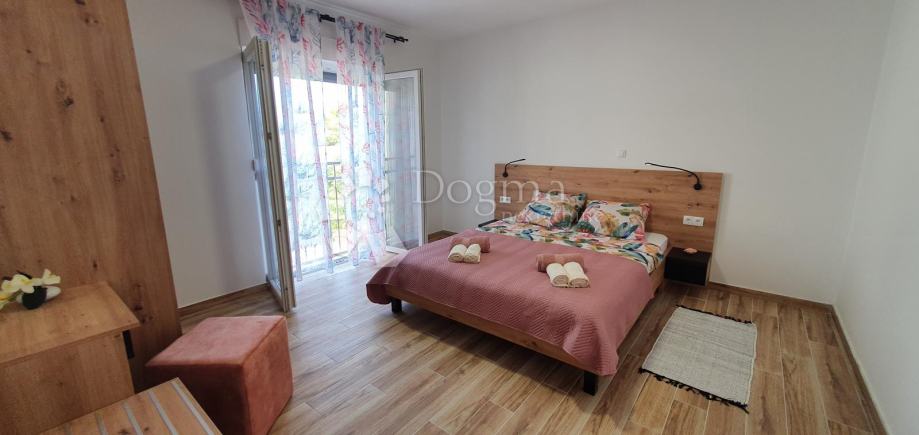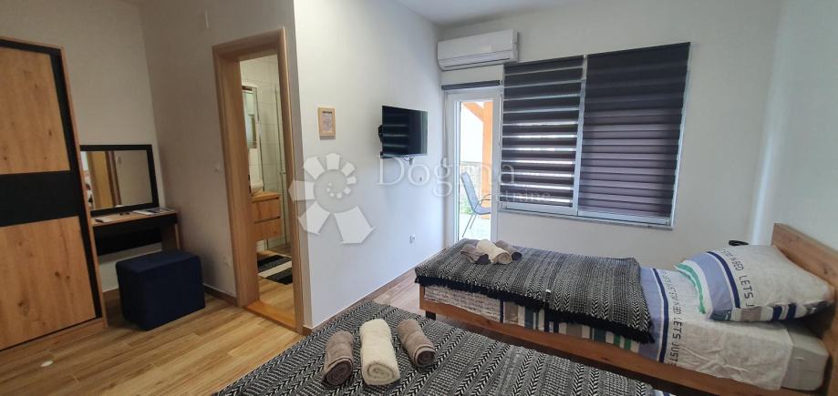 Kuća se sastoji od prizemlja i prvog kata. U prizemlju se nalaze studio apartman (17 m2) i jednosobni apartman (40 m2), a na prvom katu se nalazi jednosobni apartman (41 m2) i studio apartman (21 m2). Unutranje stubište vodi iz prizemlja na prvi kat, sve četiri jedinice imaju odvojen ulaz i vlastitu terasu, svaka prostorija je klimatizirana. Apartmani na prvom katu imaju pogled na more. Kuća je kompletno preuređena u ljeto 2022.. Korišteni su vrhunski materijali. Veličina zemljišta na kojoj se nalazi kuća je 495 m2, u vrtu se nalazi prostrani bazen, uređena okućnica i malo dječje igralište.