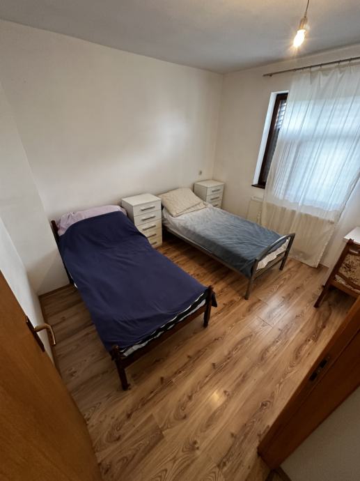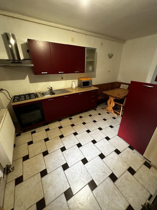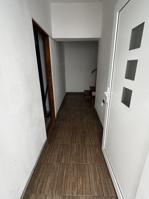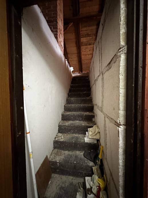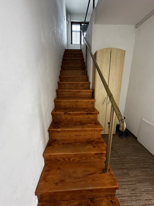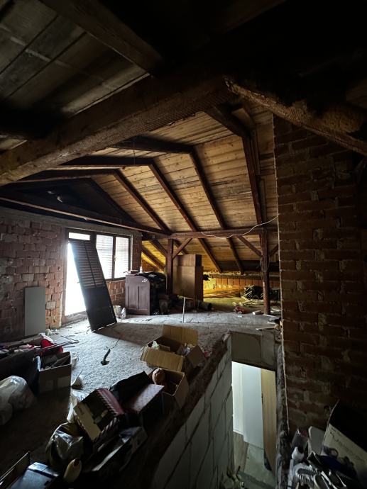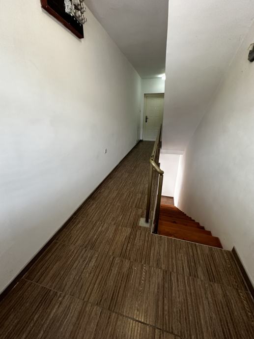 Po unutarnjim stepenicama ide se na kat , hodnik, kupaona, kuhinja, dn. boravak i tri spavaće sobe, ulaz u visoko potkrovlje ( nije uređeno).