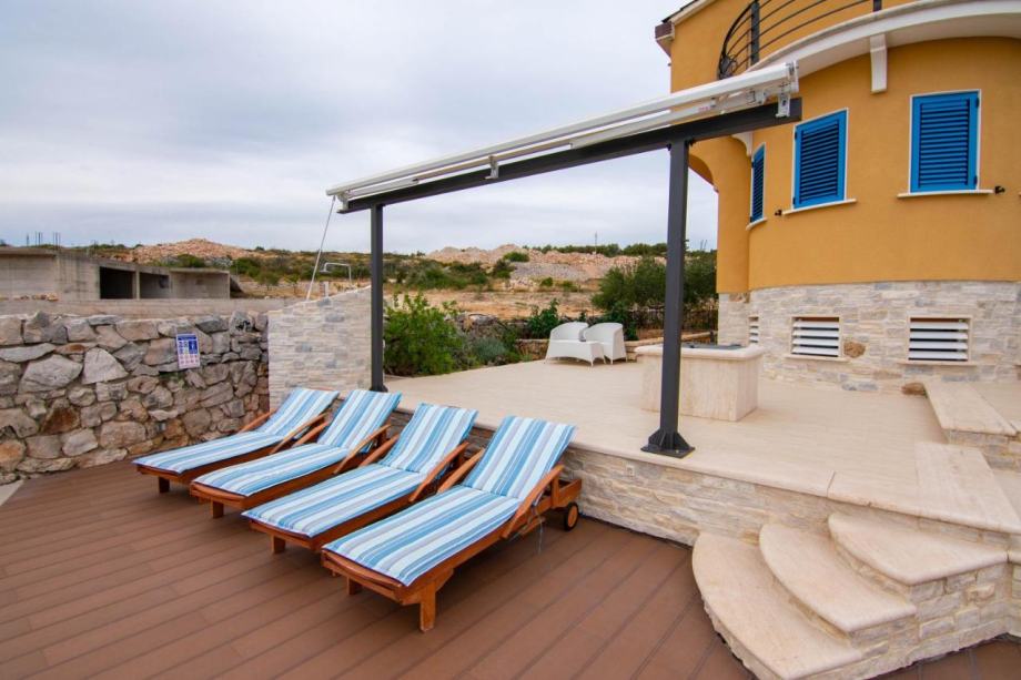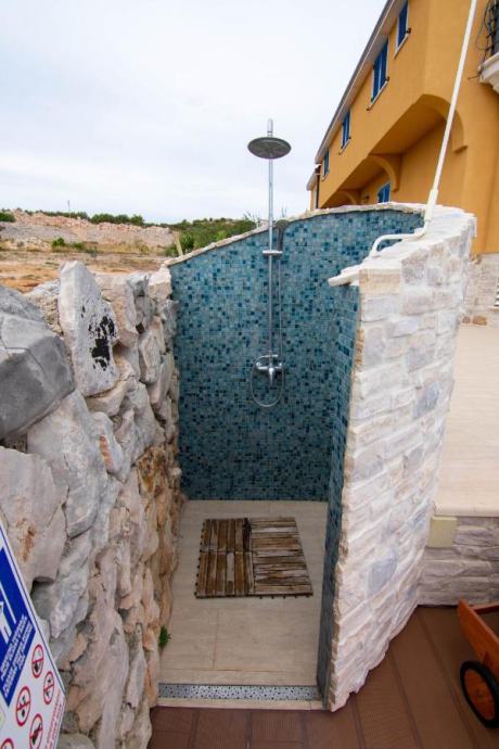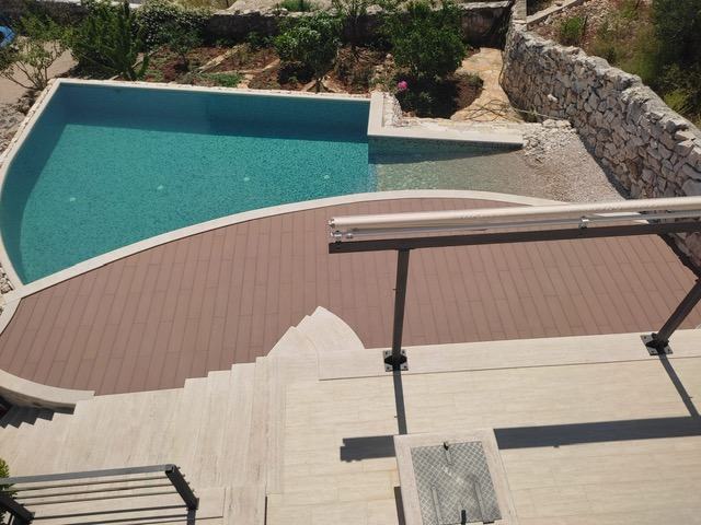 Next to the house there is a concrete swimming pool with a surface area of approx. 50 sq m . It is walled with slab stone, covered with mosaic tiles with a pebble beach at the entrance to the pool. Next to the swimming pool, under the sunbathing area, there is an equipped automatic engine room and a computer pool. The pool is filled through a well in the ground where fresh and sea water (brackish) is mixed. There is a pump in the well through which the pool is filled.