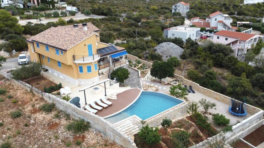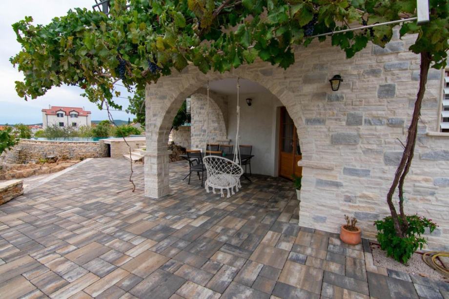 Površina parcele je 1000 m2 , a u vrtu i okolišu ima 14 stabala ( smokva, maslina, voćke…)