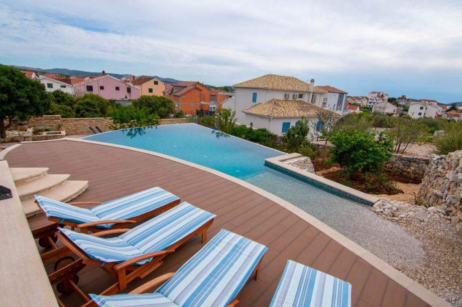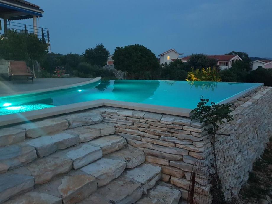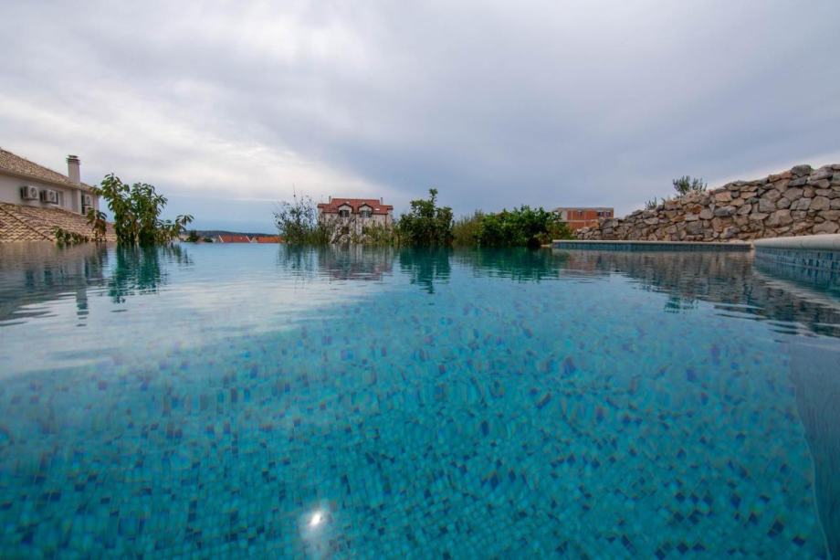 Uz kuću se nalazi betonski bazen tlocrtne površine cca 50 m2. Obzidana je pločastim kamenom, obložen mozaik pločicama sa šljunčanom plažom na ulazu u bazen. Uz bazen, ispod sunčališta nalazi se opremljena automatska strojarnica I komp.bazen. Bazen se puni preko bušotine u zemlji u kojoj se miješa slatka I morska voda (boćata). U bušotini je pumpa preko koje se bazen puni.