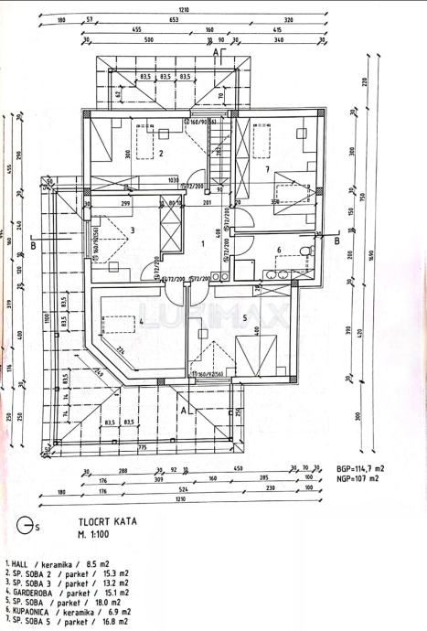 Prvi kat se sastoji od pet soba i kupaonice sa tuš kadom i WC-om.