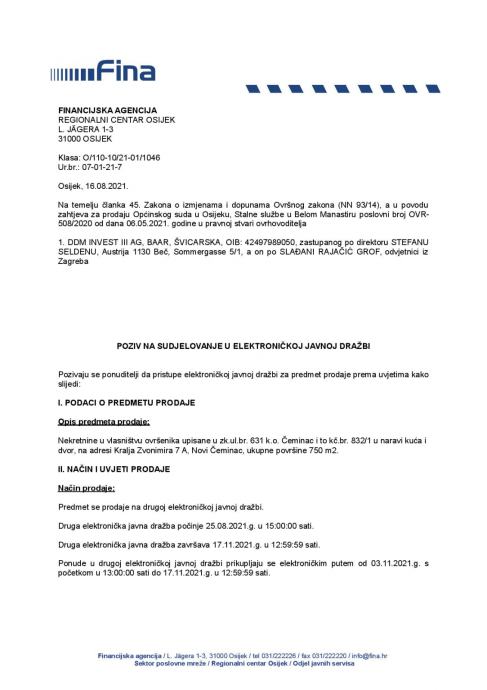 Druga elektronička javna dražba počinje 25.08.2021.g. u 15:00:00 sati.