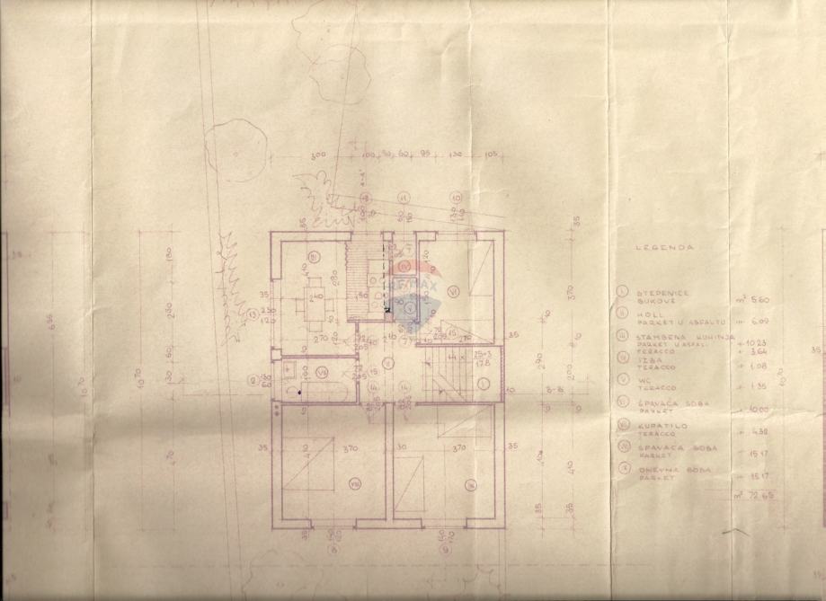 Iz verande se unutarnjim stepenjicama penje na prvi kat gdje se nalazi stan površine 73 m2 koji se sastoji od hodnika, tri spavaće sobe, kuhinje i blagovaonice, ostave, wc-a i kupaonice.