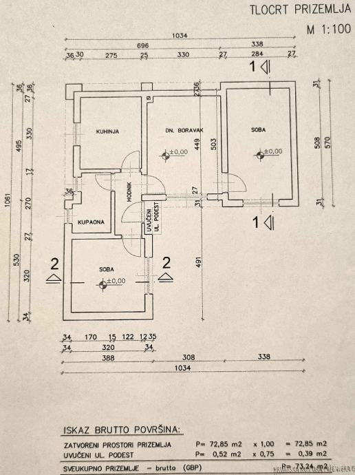 Kuća u centru površine 73 m2. Blizina škole, vrtića, jaslica, trgovina, banaka,... Sastoji se od dnevnog boravka, 2 spavaće sobe, kuhinje s blagovanjem, hodnika i kupaonice. Centralno grijanje na plin, klima uređaj. Nema tereta, vlasništvo 1/1.
