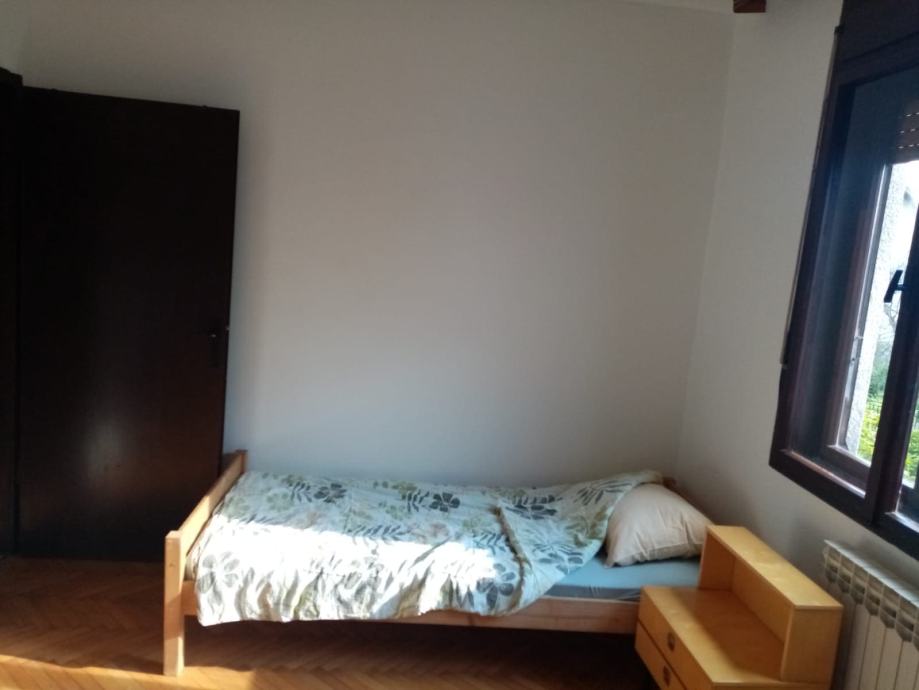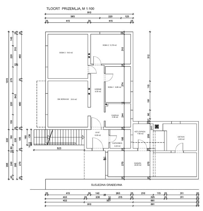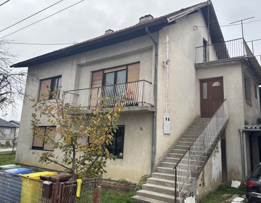 Kuća se sastoji od stana na prizemlju(86m2) i katu(90m2) i neuređenog tavana, te pomoćnih prostorija garaže, kotlovnice i spremišta od ukupno 41m2.