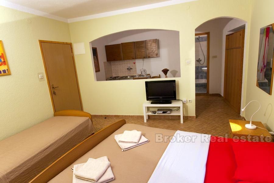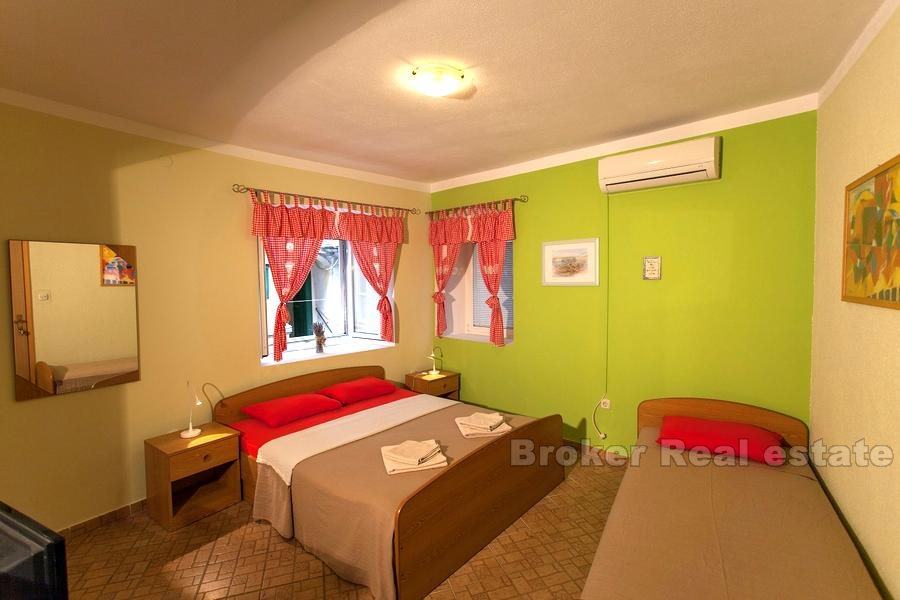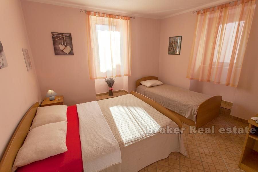 Na prvom katu se nalaze tri dvokrevetne sobe i jedan studio apartman. Na drugom katu su dva studio apartmana i donja etaža dvoetažnog stana. U potkrovlju se nalazi gornja etaža dvoetažnog stana. Taj stan se sastoji od dnevnog boravka s kuhinjom i blagovaonicom, ostavom, praonicom rublja i terasom, a na katu se nalaze dvije spavaće sobe, kupaonica i garderoba.