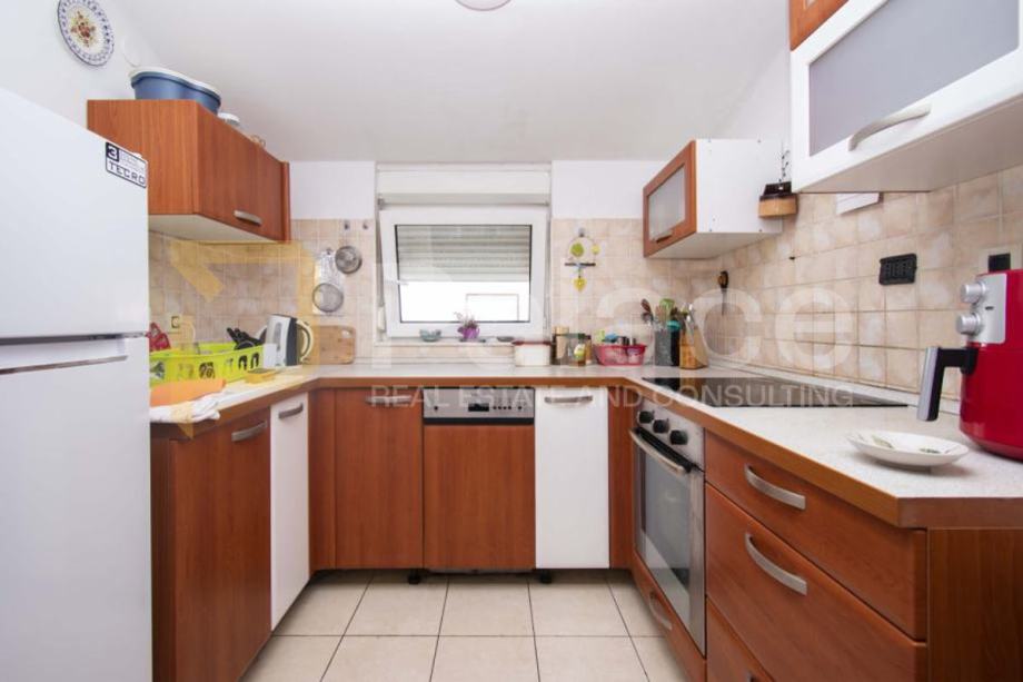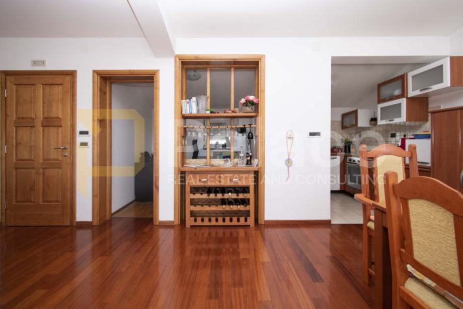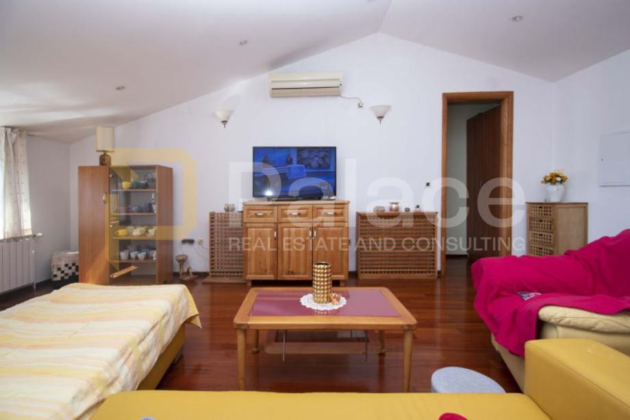 U prizemlju je stan koji ima kuhinju, blagovaonicu i dnevni boravak te kupaonice i spavaću sobu. U odvojenim prostorijama nalaze se sustavi za centralno kao i bojler za solarne panele. Na katu su dva manja stana, svaki s kuhinjom, blagovaonicom i dnevnim boravkom u jednoj prostoriji te zasebnom spavaćom sobom i kupaonicom. Svaki stan ima svoju terasu.Na drugom katu je prostrani, osunčani stan s jednom spavaćom sobom i lijepim pogledom.