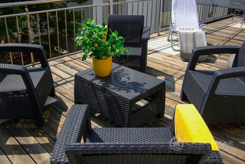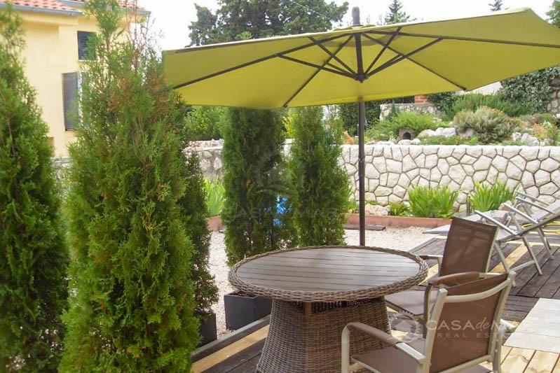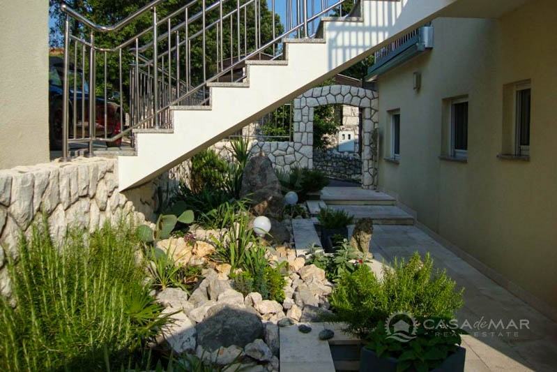 Na prekrasno uređenoj okućnici se nalazi vanjski tuš, kamin sa roštiljem i mala krušna peć, te prostrane terase prigodne za sunčanje i vanjski boravak. Materijali koji su ugrađeni u kuću su vrhunske kvalitete. Cjelokupna kuća je u potpunosti namještena sa kvalitetnim namještajem.