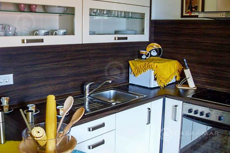 Prizemlje se sastoji od dvosobnog stana sa dnevnim boravkom, vanjskom ljetnom kuhinjom sa kaminom, vanjskim tušem i garažom. Kat se sastoji od dva jednosobna apartmana, sa dnevnim boravkom i kuhinjom te vlastitom terasom.