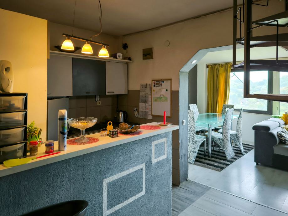Gornji stan : Obuhvaća hodnik, kupaonicu, toalet, spavaću sobu, kuhinju s blagovaonicom i dnevnim boravkom, te balkon s prekrasnim pogledom.