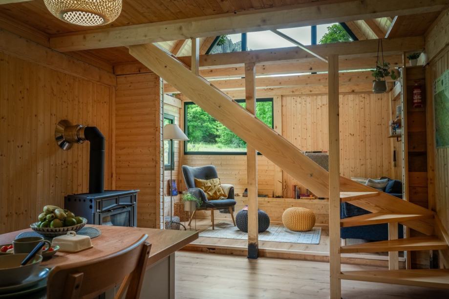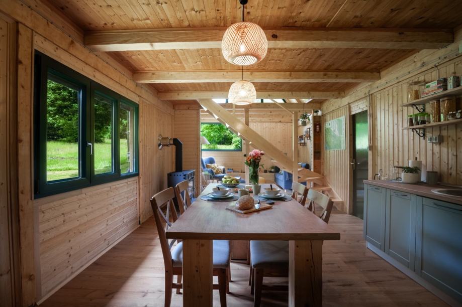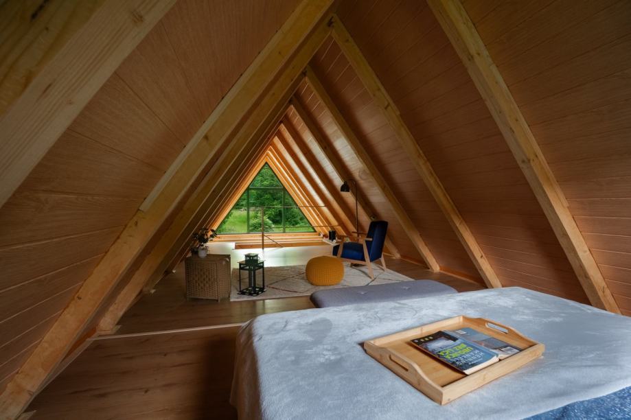 Interijeri se mogu pohvaliti potpuno renoviranom kuhinjom, kupaonicom, blagovaonicom i dnevnim boravkom, svi s novom PVC stolarijom, oblogama i laminatnim podovima. Drveno stubište vodi do gornjeg kata, gdje veliki stakleni zid nudi prekrasan pogled na stijene Bačić kuka.
