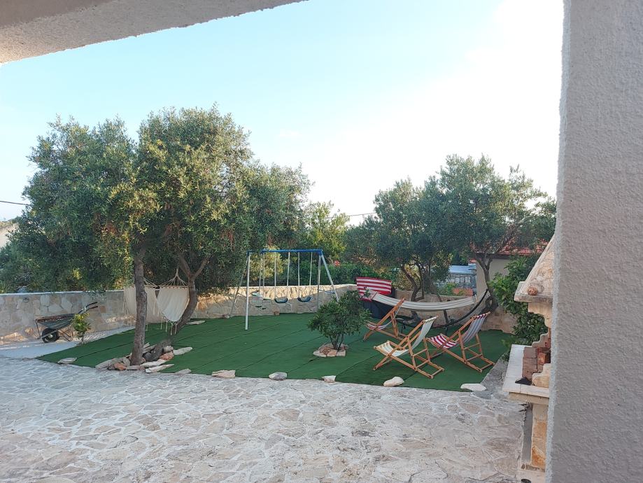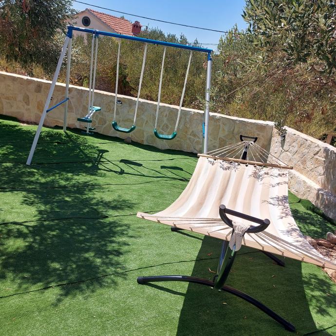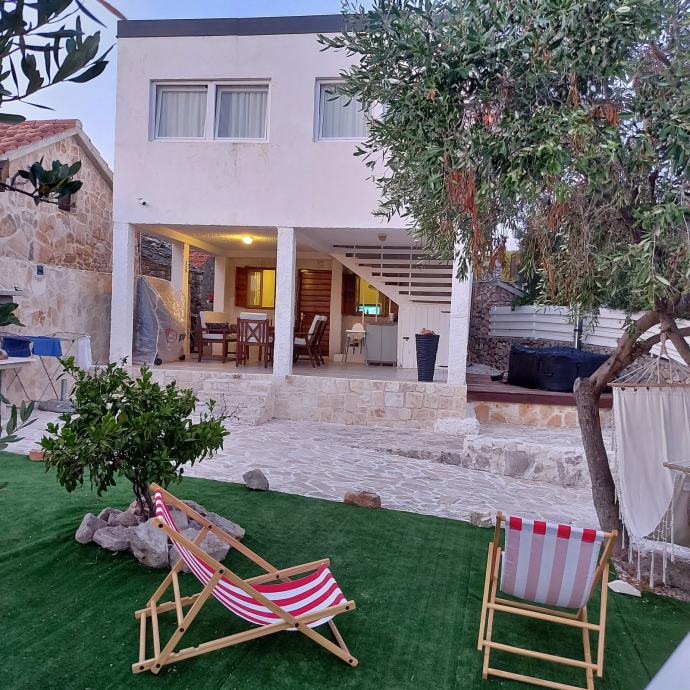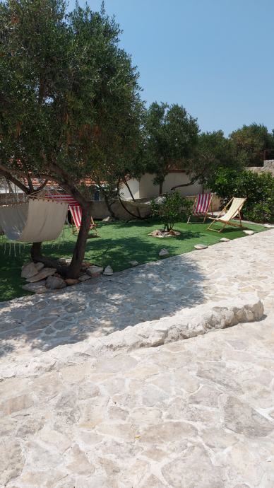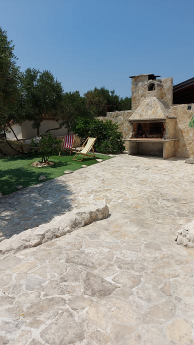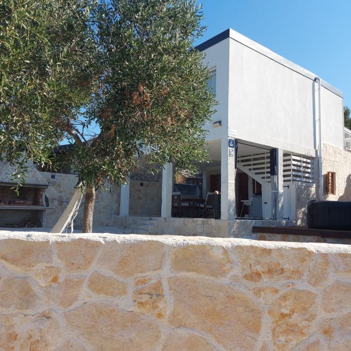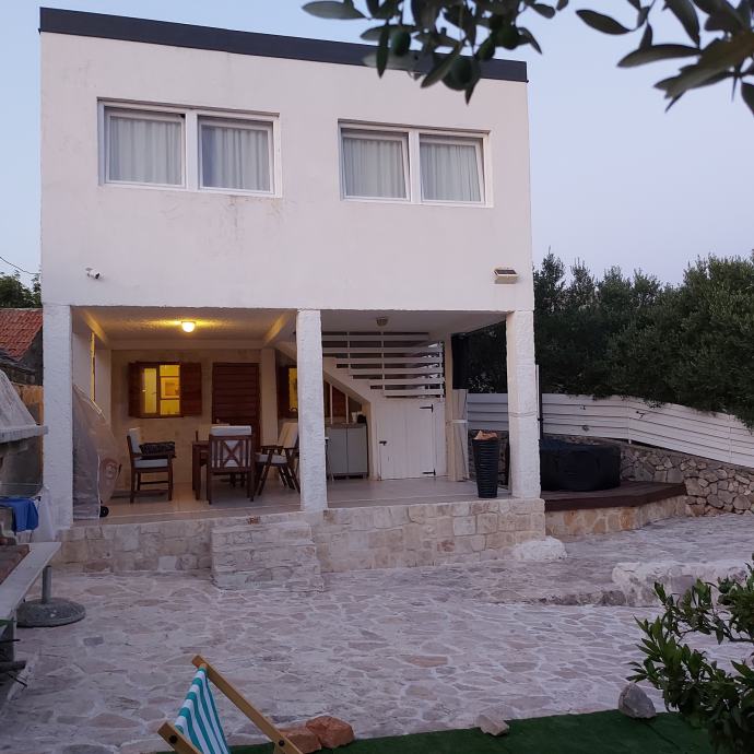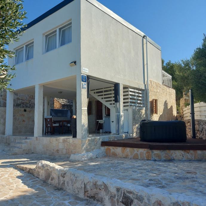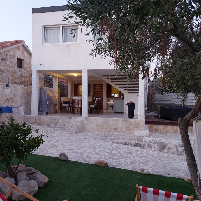 Kuča je smještena u manjem,mirnom naselju otoka,zemljište 215 m2 ,uredžene okučnice sa Bračkim kamenom i belim peskom sa rasvijetom i vanjskim kaminom.Kamena ograda.