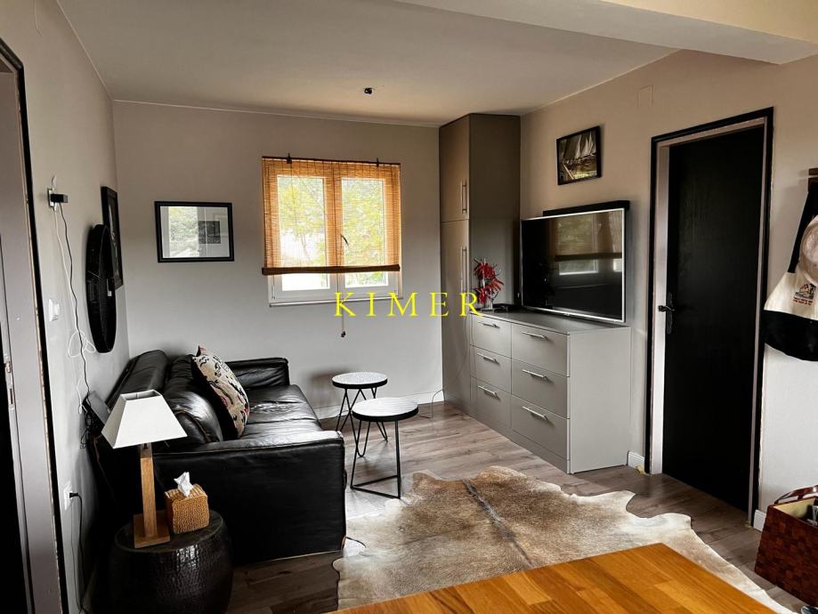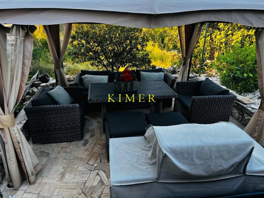 The lower unit on the ground floor of the house is a large studio apartment with a kitchen, a bedroom, a bathroom with a toilet, and an outdoor terrace with a barbecue and covered seating.
