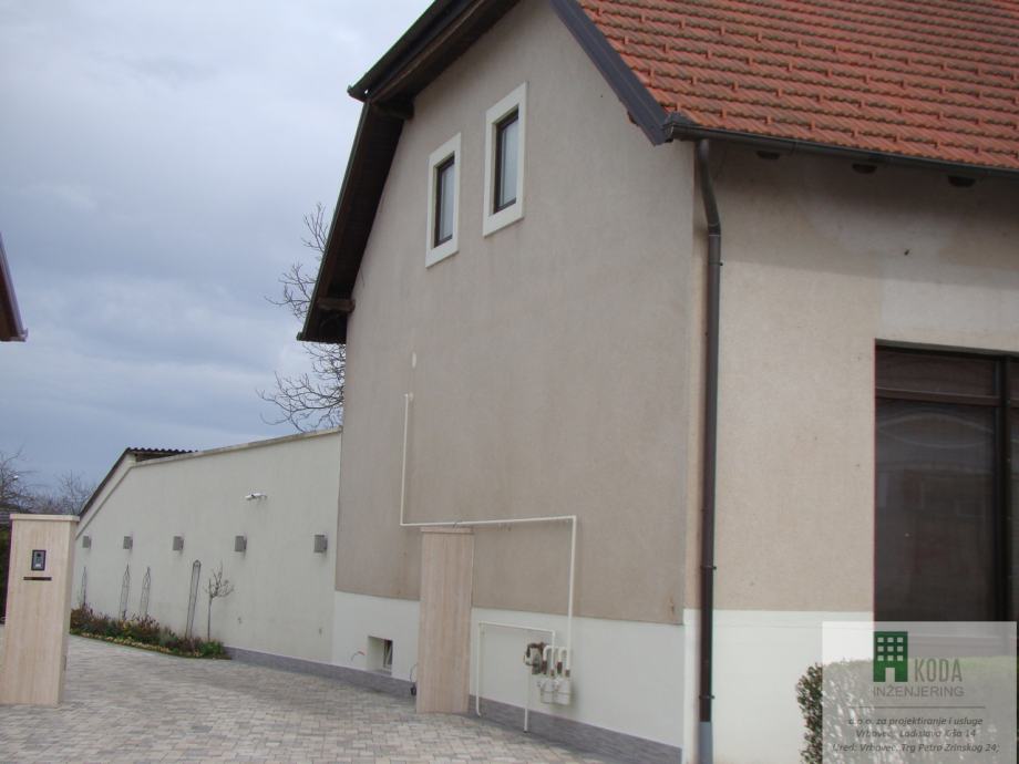 Kuća ima tri etaže, podrum, prizemlje i potkrovlje. Kuća se sastoji od cca 250 m2 stambenog prostora, poslovnog prostora veličine cca 80 m2, podruma veličine cca 60 m2 te garaže i pomoćne prostorije površine cca 100 m2.