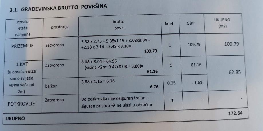 Zemljište površine 3477 m2, kuća ukupne površine 172.64 m2 na dvije etaže, pomoćni objekt od 18.5 m2. Vlasništvo je čisto 1/1 i bez tereta. Kuća i pomoćni objekt su legalizirani.