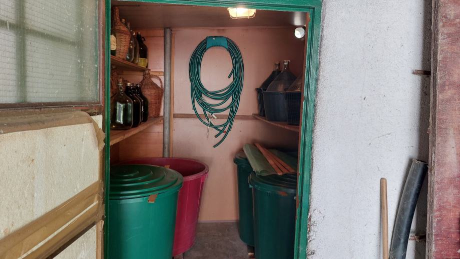 Pomoćni objekt od 18.5 m2 sastoji se od dvije prostorije. Jedna je alatnica (kosilica, motike…), a druga služi kao „podrum“ za vino i rakiju te je posebno termoizolacijski izolirana kako bi imala stalnu temperaturu.