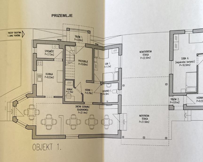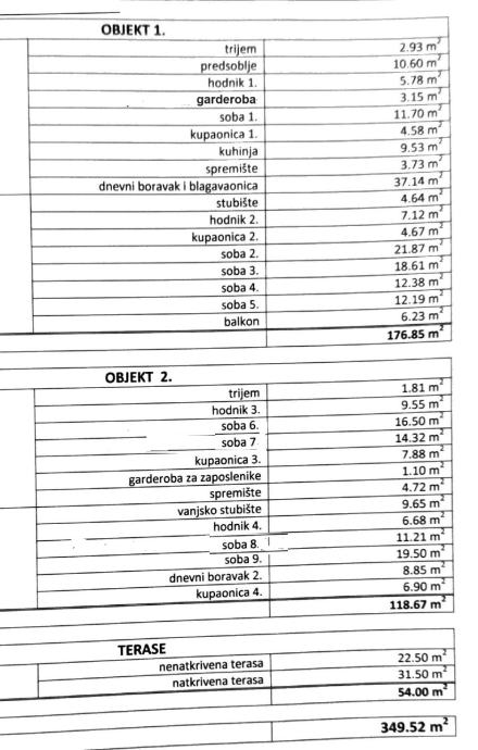 Objekt 1 - prizemlje i kat tlocrtne površine 105 m2, ukupne površine 176,85 m2, sastoji se od 5 soba, dnevnog boravka i blagovaonice, kuhinje, garderobe, 2 kupaonice ( prizemlje i kat) dva hodnika, trijem, predsoblja i balkona.