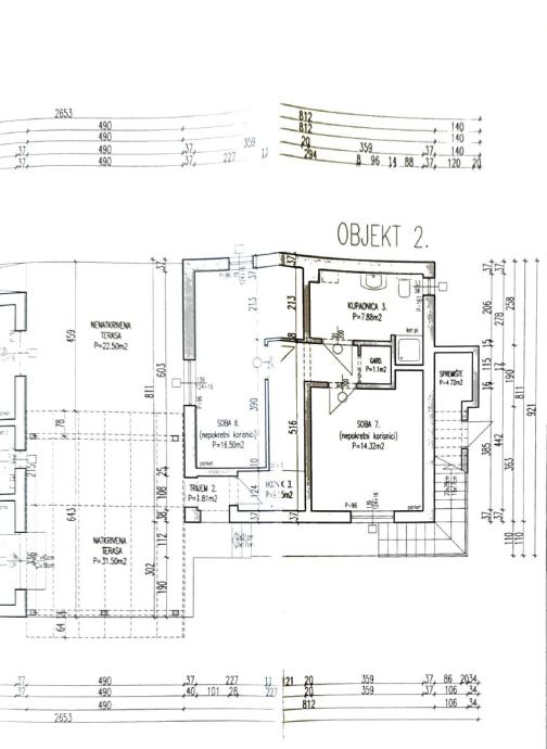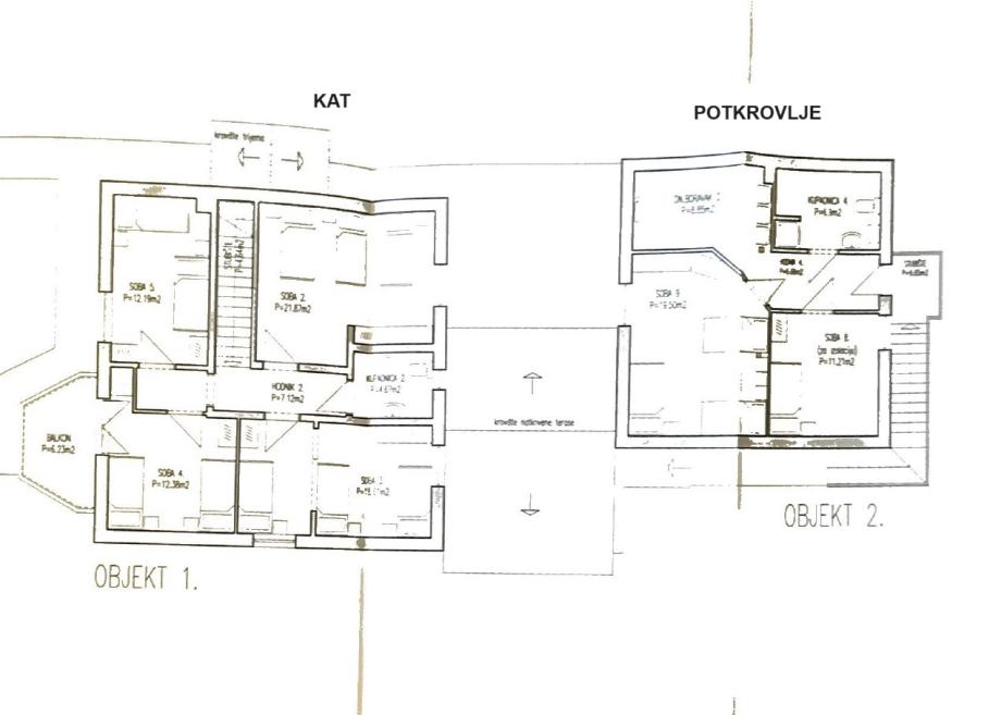 Objekt 2- prizemlje i potkrovlje tlocrtne površine 64 m2, u potkrovlje koje se dolazi vanjskim stubištem ukupne površine 118,67m2 , sastoji se od 4 soba, dnevnog boravka, garderobe, 2 kupaonice ( prizemlje i kat) dva hodnika, trijem, vanjsko stubište, spremište.