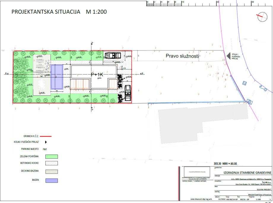 Do kuće vodi novi asfaltirani put te svi priključci vode, struje i kanalizacije, zemljište na kojem se nalazi objekt je ukupne površine 836 m2, te ima direktan izlaz na ulicu Ivana Meštrovića preko prava služnosti. Objekt se nalazi u fazi izgradnje te su na njemu izvedeni grubi građevinski radovi (armirano betonski), izolacijski radovi (izolacija temelja, ravnog krova te fasada), postavljeni svi vanjski zatvori od pvc -a s roletama. Unutar kuće je provedena struja, te je kuća spremna za priključenje, izvedeni su i knauferski radovi. Urađeni su i iskopi za vanjski bazen.