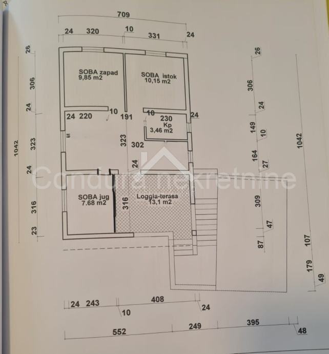 Vanjske stepenice vode na kat kuće gdje se nalazi apartman sa tri spavaće sobe, dnevnim boravkom, kuhinjom, kupaonom i prostranom natkrivenom terasom koja nudi mogućnost ugradnje jacuzzija.