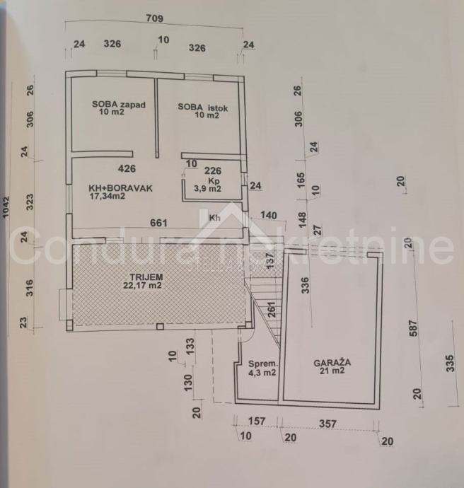 U dvorištu se nalazi i garaža površine 21m2 sa provedenim strujnim i vodnim instalacijama, moguća prenamjena u manji apartman.