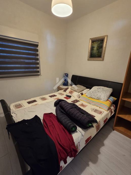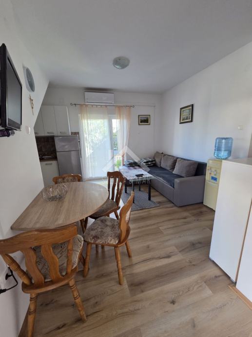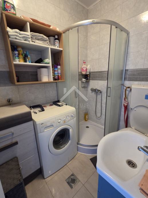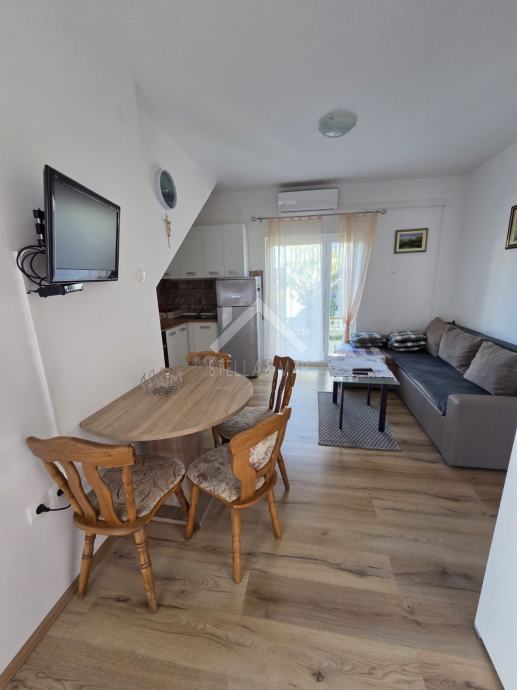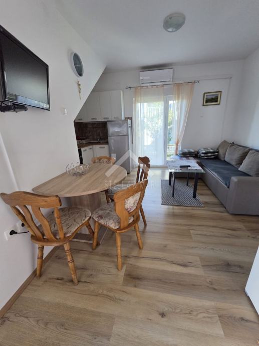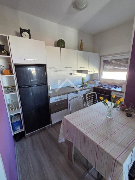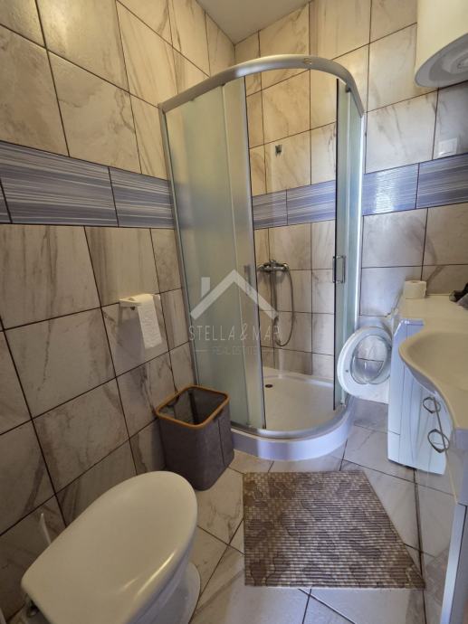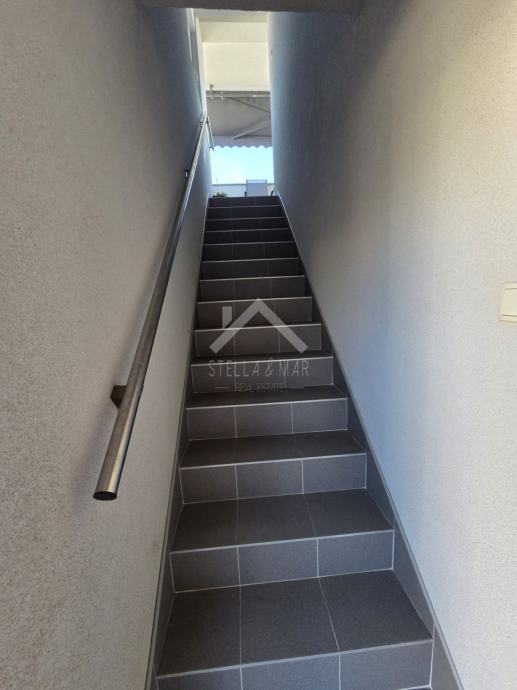 Vanjske stepenice vode na kat kuće gdje se nalazi apartman površine 46,64m2 istog rasporeda. Sa terase se pruža pogled na more.