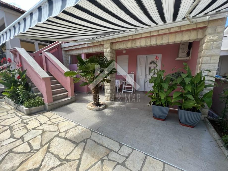 Dvorište je uređeno palmama i zelenilom. Parkirno mjesto za dva vozila. Kuća je spojena na gradsku vodu i kanalizaciju. Udaljenost do mora je cca 200m a do trgovine i restorana nepunih 100m. Kompletno je namještena te se takva i prodaje.