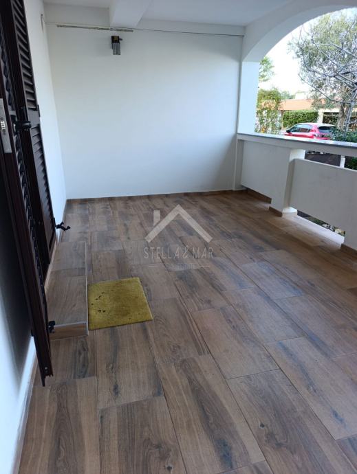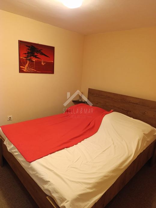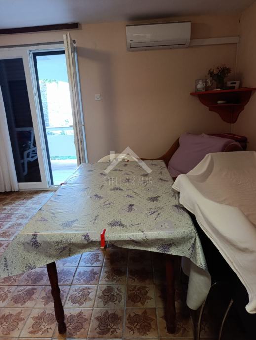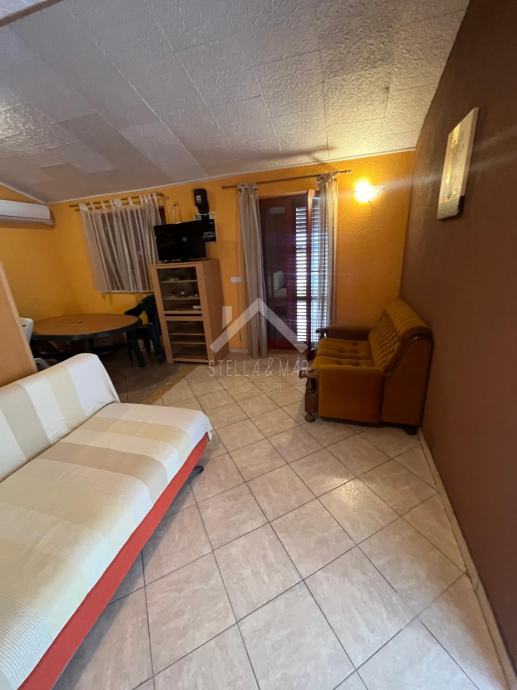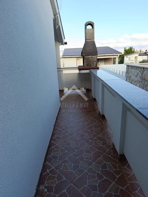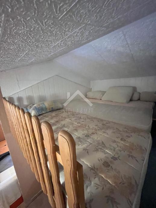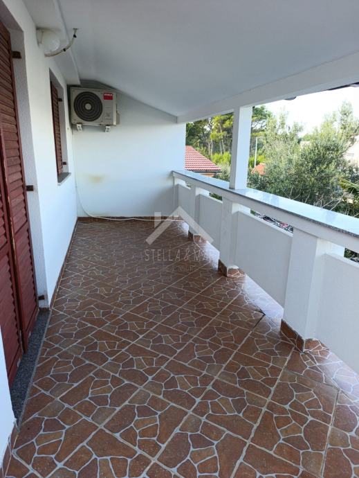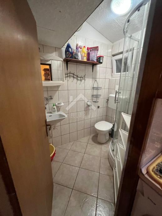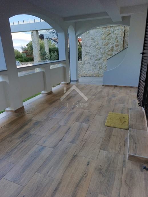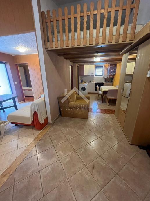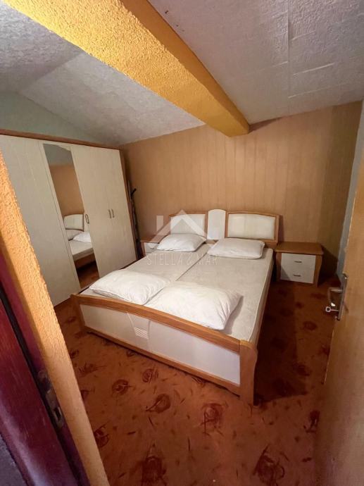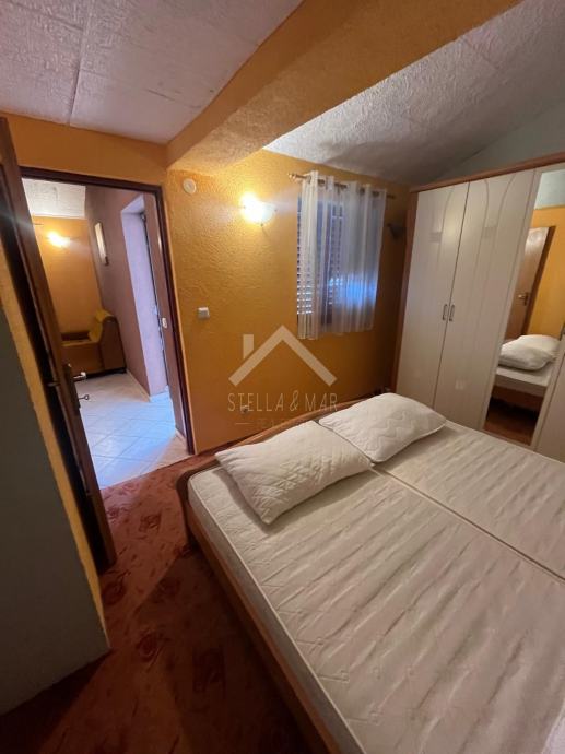 Apartman u prizemlju sastoji se od kuhinje sa blagovaonicom i dnevnog boravka, kupaonice, dvije spavaće sobe i prostrane, natkrivene terase. Vanjsko stubište vodi do apartmana na prvom katu koji uključuje kuhinju sa blagovaonicom, spavaću sobu, galeriju, kupaonicu, ostavu i terasu s pogledom na more. Spremište ispod stepenica, roštilj na vanjskoj terasi na katu. Parking za dva automobila dostupan je u dvorištu.