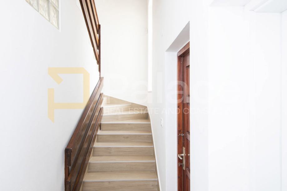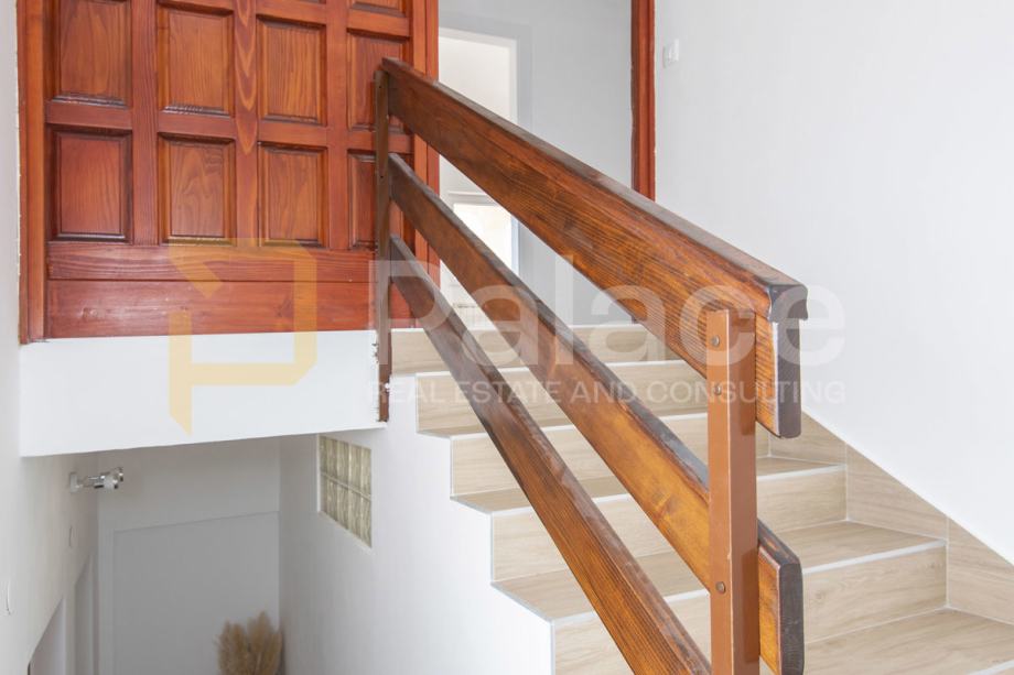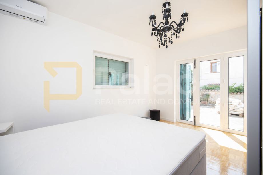 Na parceli površine 800 m2 nalazi se kuća s dva stana i odvojenim ulazima. Prvi stan, u prizemlju, se sastoji od tri spavaće sobe, kuhinje, blagovaonice i dnevnog boravka u jednom prostoru, hodnika i kupaonice. Ukoliko ima potrebe, s manjim preinakama se može dobiti još jedna kupaonica. S druge strane kuće je ulaz koji vodi do gornjeg kata gdje se nalazi prostrana kuhinja s blagovaonicom i dnevnim boravkom, dvije spavaće sobe, dvije kupaonice. Stan ima izlaz na terasu s koje se pruža pogled na more.