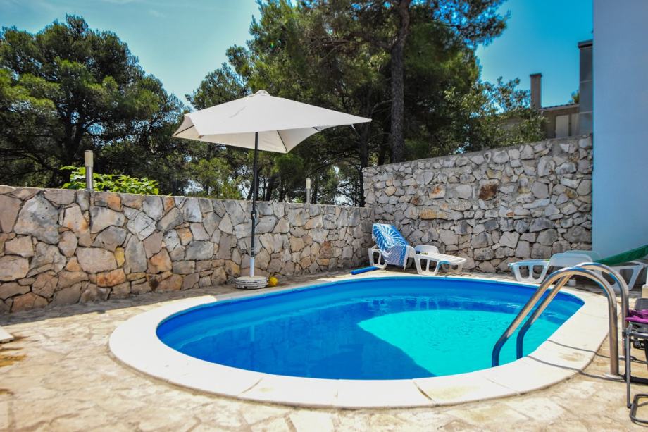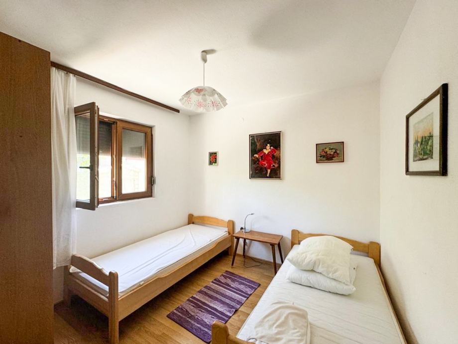 Prodaje se šarmantna dvojna kuća smještena usred mirne borove šume, idealna za ljubitelje prirode i privatnosti. Kuća se nalazi 1,5 kilometara od obale mora, pružajući savršen balans između prirodnog okruženja i blizine plaže. Uz kuću se nalazi bazen površine cca 18 m2, savršen za opuštanje i osvježenje tijekom ljetnih dana.