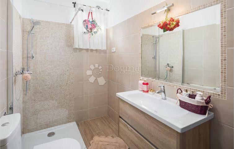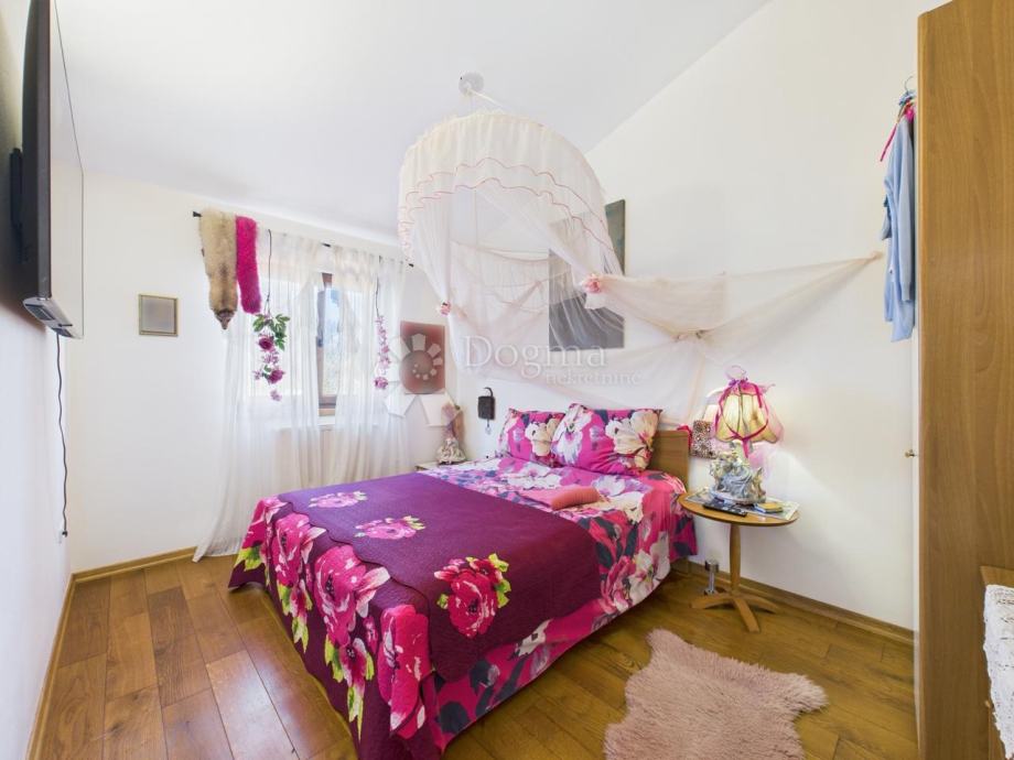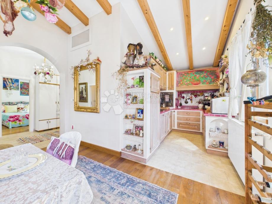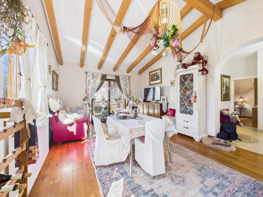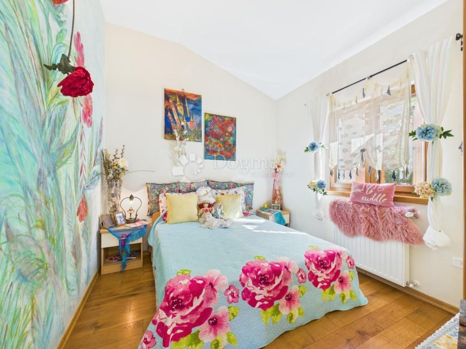 Na prodaju je predivna kuća ukupne površine 172 m², raspoređena u dva stana. Prvi stan u suterenu uključuje ostavu, spavaću sobu, open space kuhinju s blagovaonicom i dnevnim boravkom te luksuznu kupaonicu sa saunom. Drugi stan smješten je na gornjoj etaži i sastoji se od dvije velike spavaće sobe, jedne dječje spavaće sobe, kupaonice, kuhinje te prostranog dnevnog boravka s blagovaonicom i izlazom na veliku terasu. Kuća je izgrađena 2018. godine i unikatno je uređena u umjetničkom stilu s visokokvalitetnim materijalima.