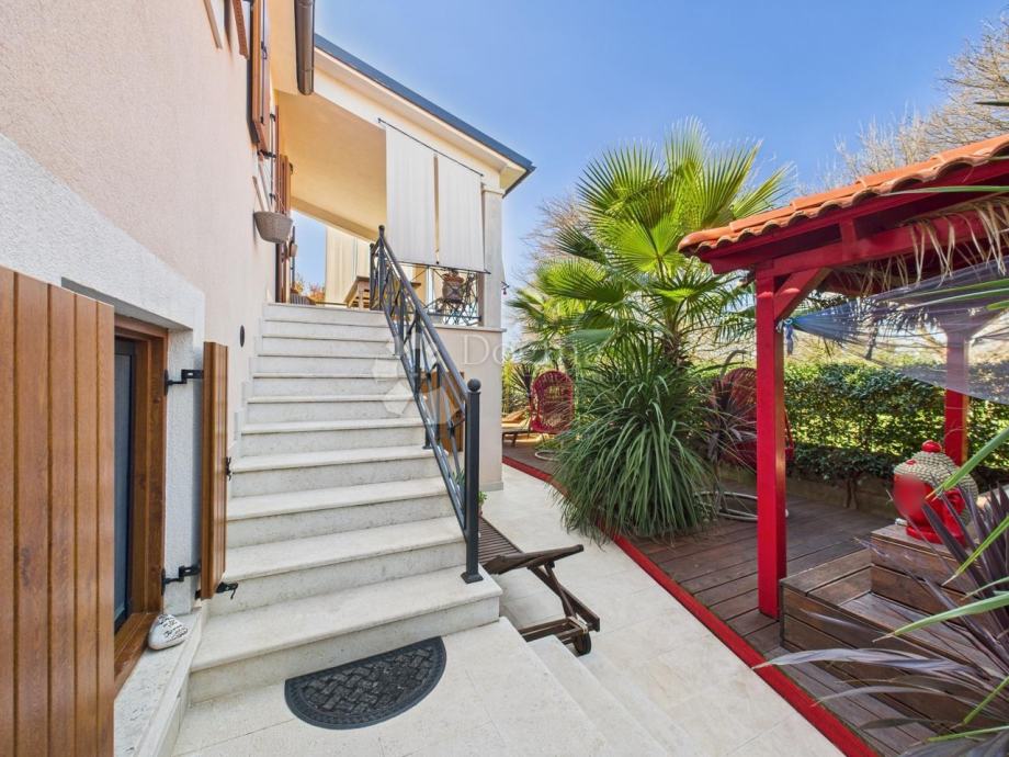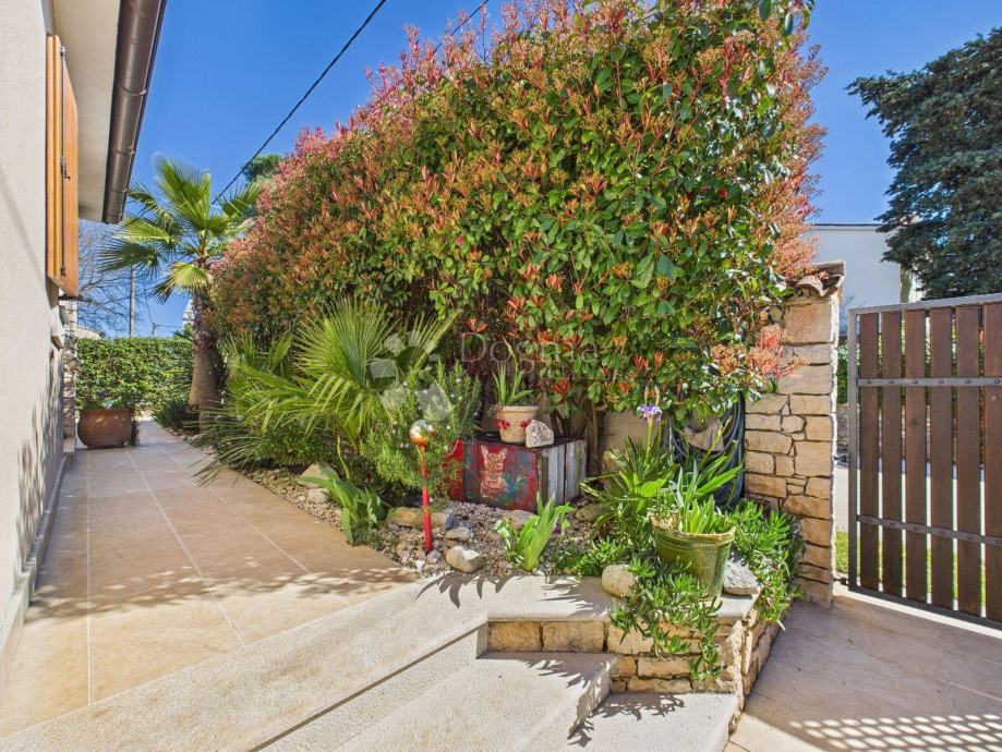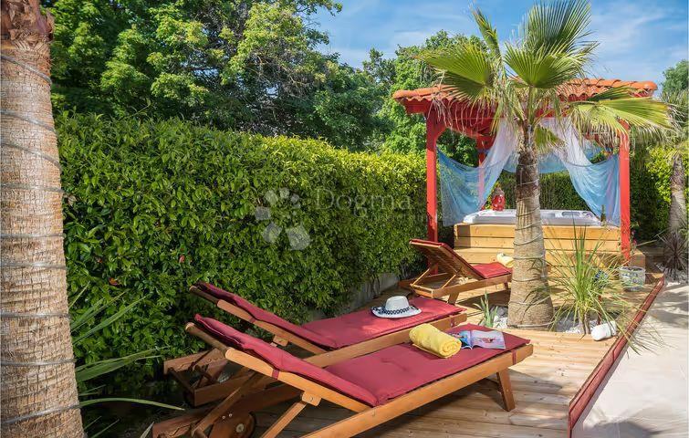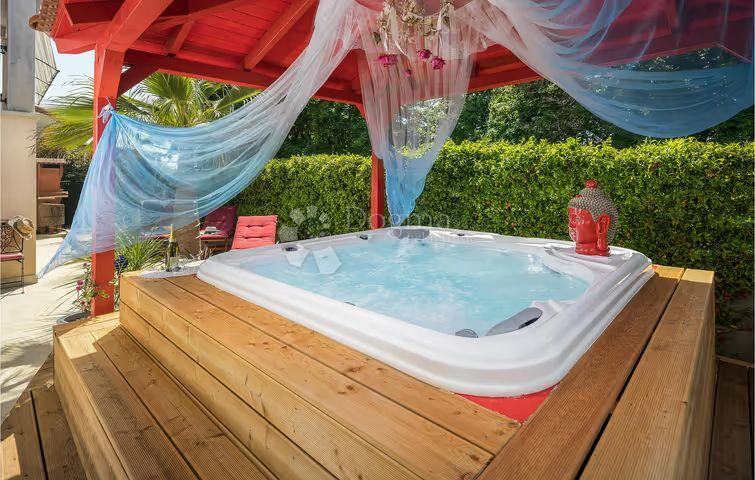 U dvorištu kuće nalazi se veliki natkriveni jacuzzi za 6 osoba, roštilj, sunčalište i jedno parkirno mjesto. Kuća je u cijelosti ograđena visokom živom ogradom koja osigurava potpunu privatnost i mir. Idealno je mjesto za obiteljsku, ali i luksuznu ljetnu ili stalnu rezidenciju.