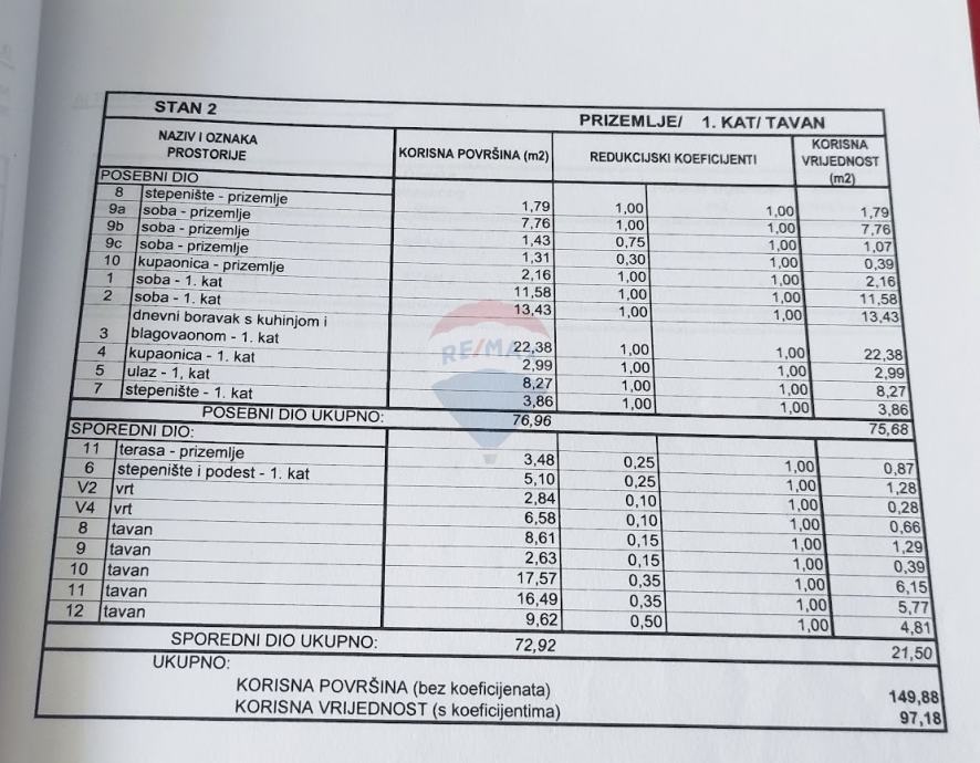 Stan se uredno koristi za život. Površina stana iznosi cca 60 m2, a ukupna površina s pripadajućim dijelovima iznosi 97,18 m2.