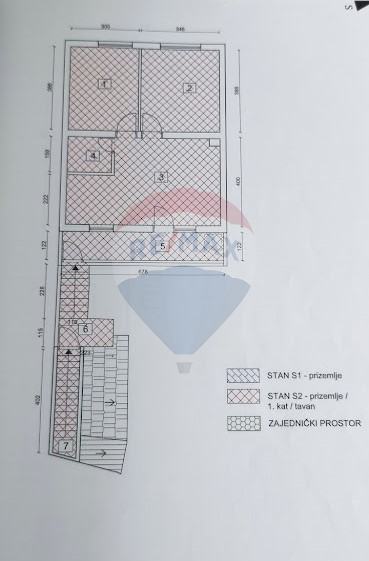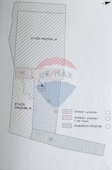 Prizemlje je u stanju za potpunu renovaciju, sastoji se od dvije spavaće sobe, hodnika, dnevnog boravka, kuhinje s blagovaonicom i kupaonice te balkona. Površina samog stana u prizemlju iznosi 49,01 m2, s pripadajućim balkonom, terasom i vrtom ukupna korisna površina prizemlja iznosi 100,46 m2, s koeficijentima 60,41 m2.