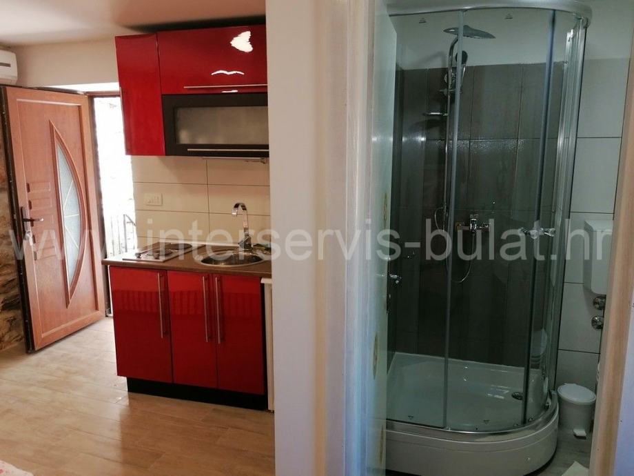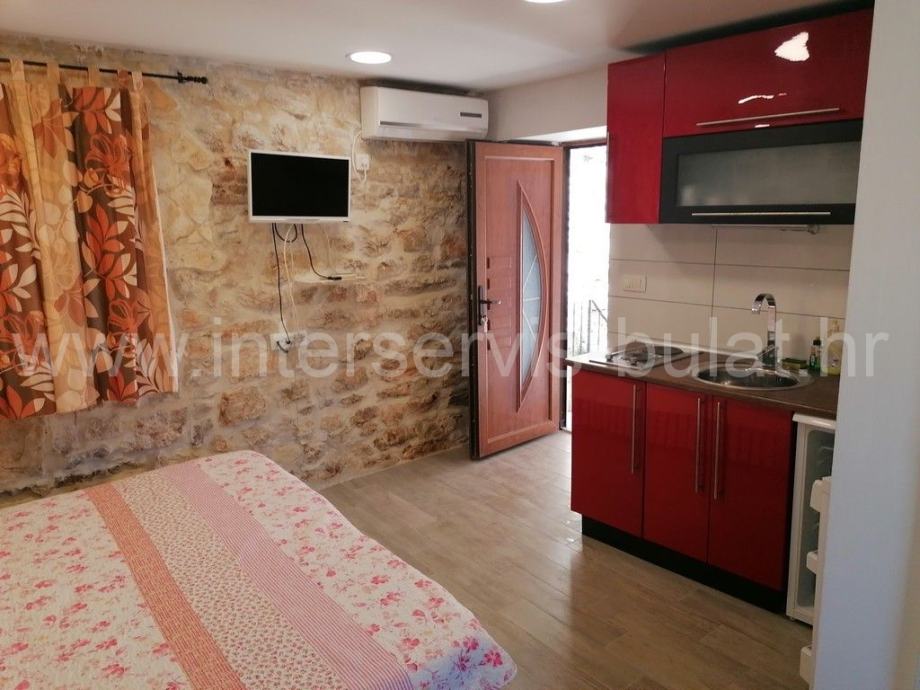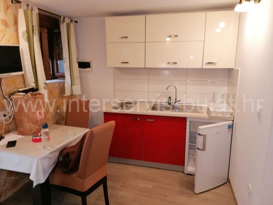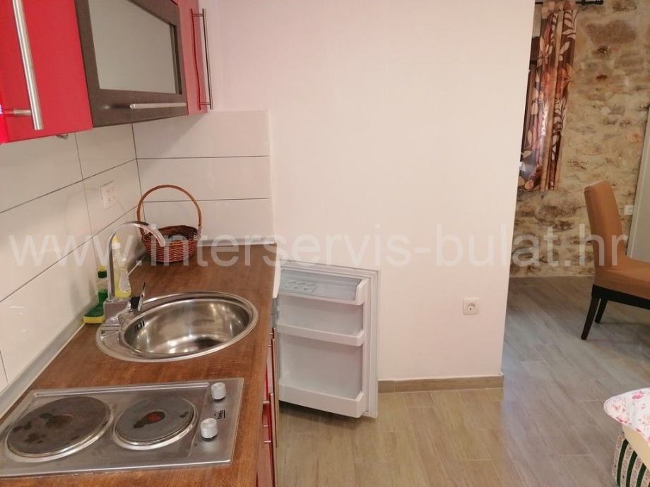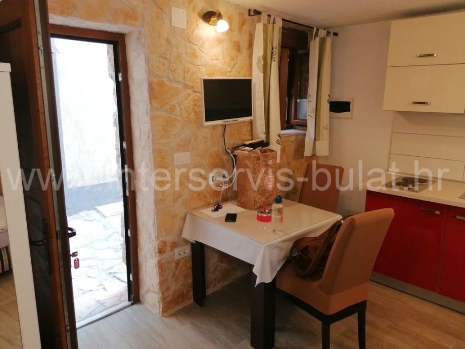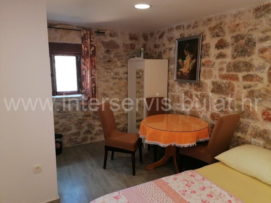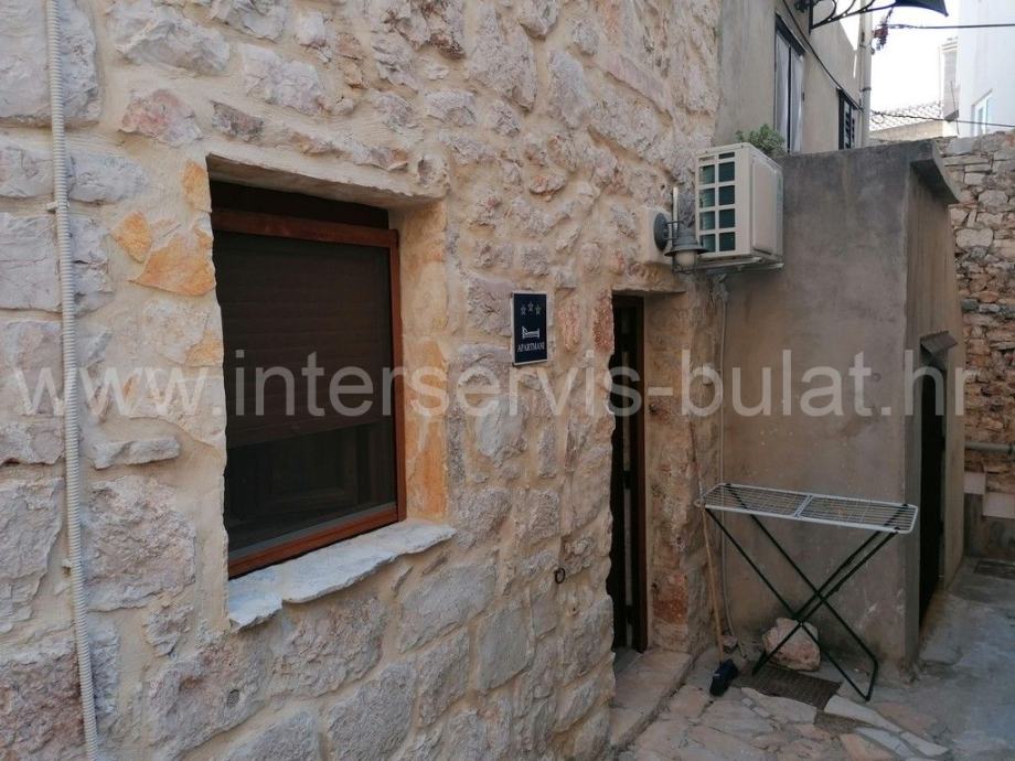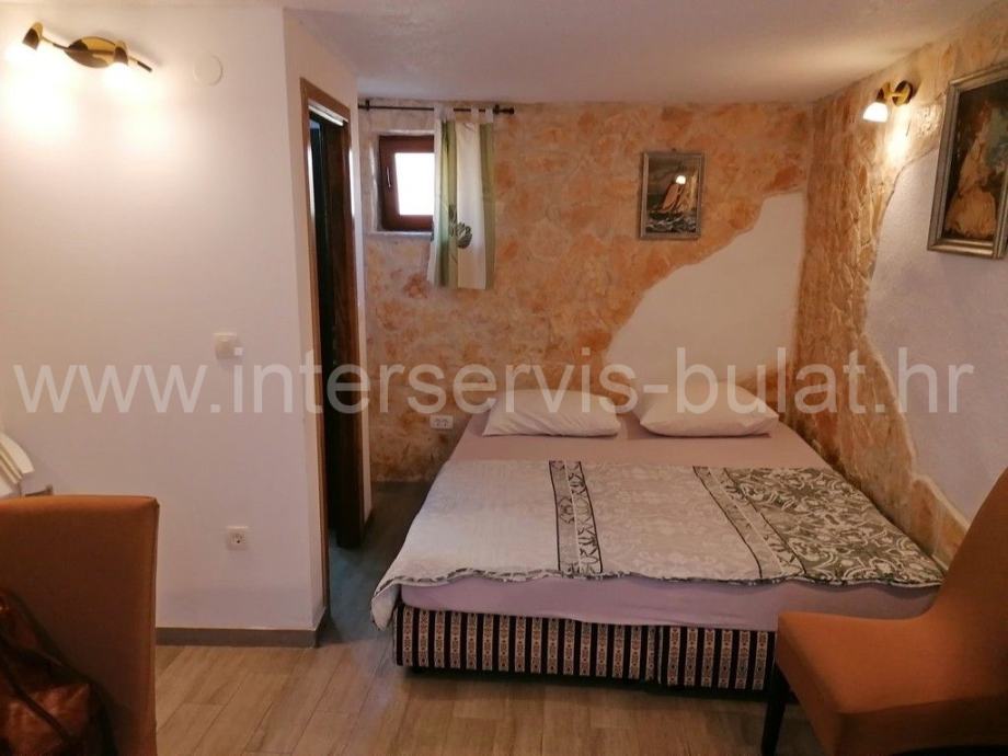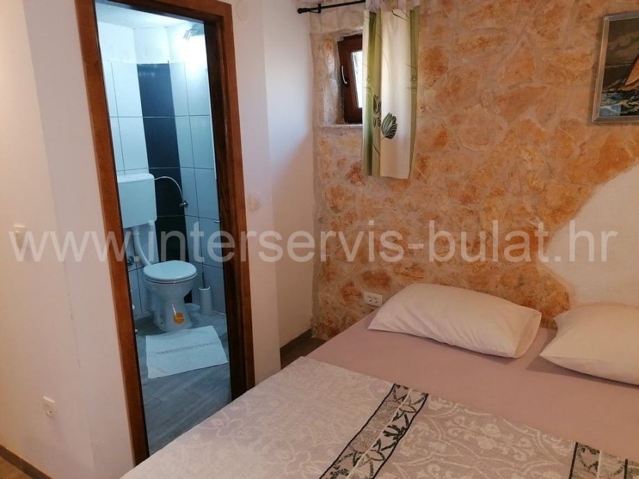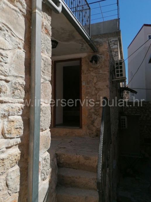 U Tisnom se nalazi kamena kuća u nizu površine 52m2. Sastoji se od prizemlja i kata sa po jednom garsonijerom identičnog izgleda i veličine. Garsonijere su površine po 26m2 i lijepo uređene te namještene. Riva je udaljena 80m dok do plaže ima 480m. Lokacija je mirna i u blizinu su ugostiteljski objekti i centar mjesta.