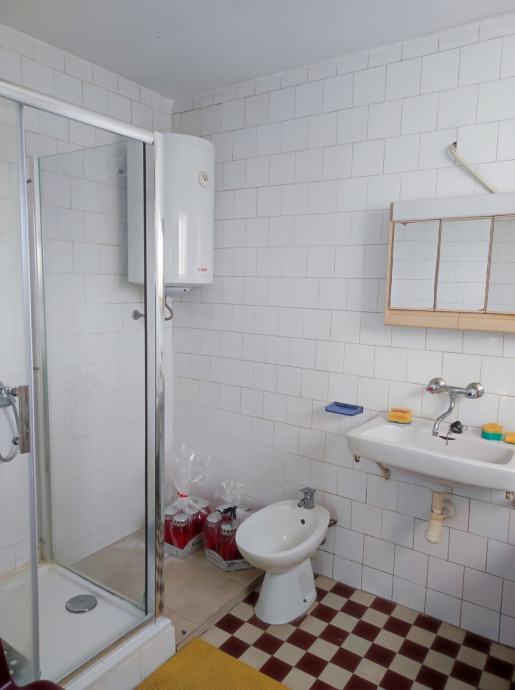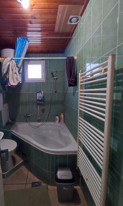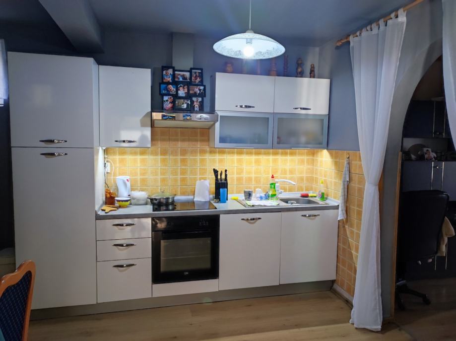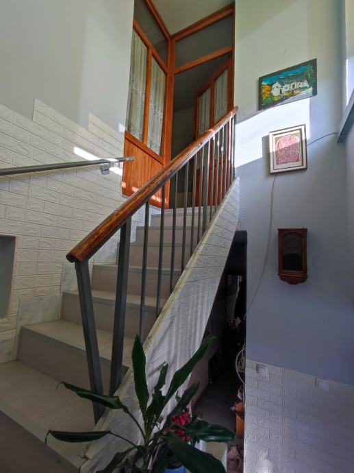 Drugi ulaz sastoji se od hodnika i velike dnevne sobe s trpezarijom i kuhinjom ( kuhinjski namještaj u cijeni nekretnine ) u prizemlju, te hodnika , dvije sobe i kupaone na katu.